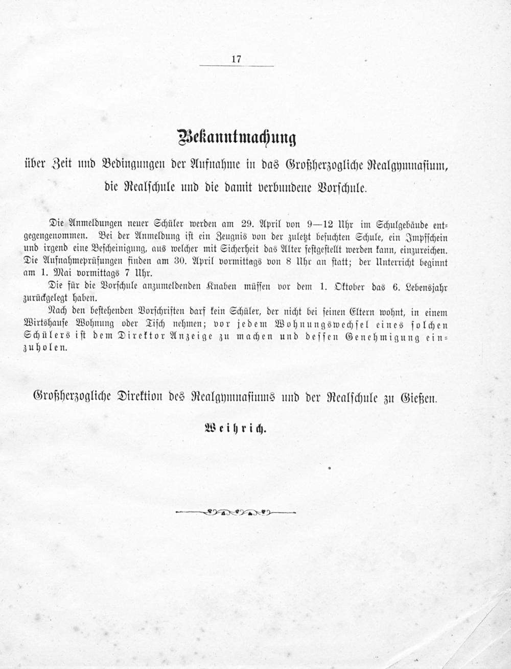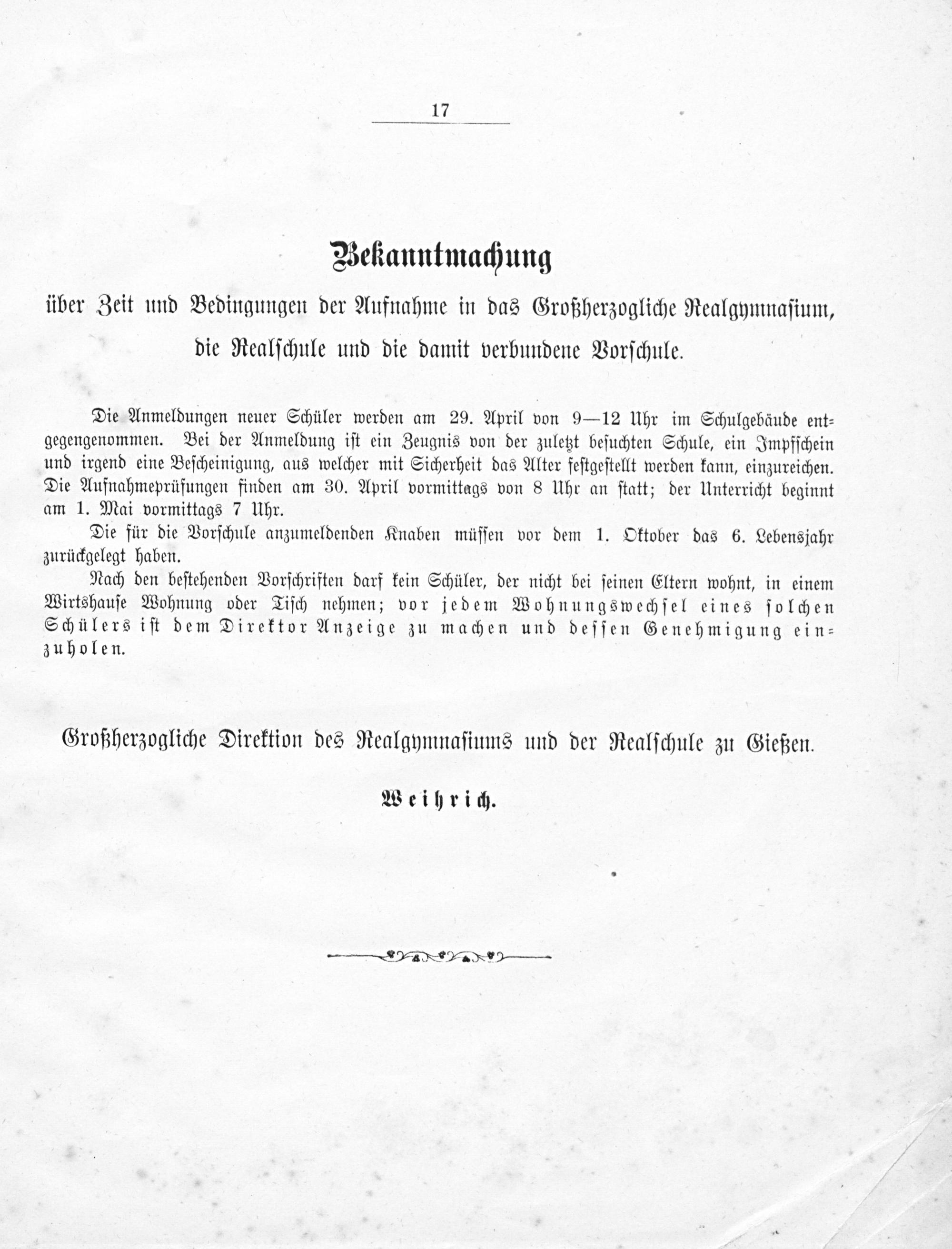 über Zeit und Bedingungen der Aufnahme in das Großherzogliche Realgymnaſium, die Realſchule und die damit verbundene Vorſchule.