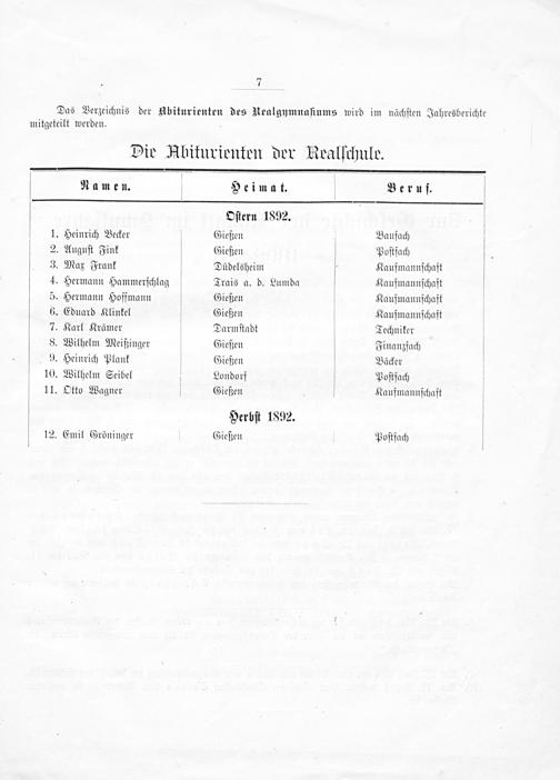 Namen. V Heimat. Beruf. Oſtern 1892. 1. Heinrich Becker Gießen Baufach 2. Auguſt Fink Gießen Poſtfach 3. Max Frank Düdelsheim Kaufmannſchaft 4. Hermann Hammerſchlag Trais a. d. Lumda Kaufmannſchaft 5. Hermann Hoffmann Gießen Kaufmannſchaft 6. Eduard Klinkel Gießen Kaufmannſchaft 7. Karl Krämer V Darmſtadt Techniker 8. Wilhelm Meißinger Gießen Finanzfach V 9. Heinrich Plank Gießen Bäcker 10. Wilhelm Seibel Londorf Poſtfach I 11. Otto Wagner Gießen Kaufmannſchaft Herbſt 1892. V 12. Emil Gröninger Gießen Poſtfach