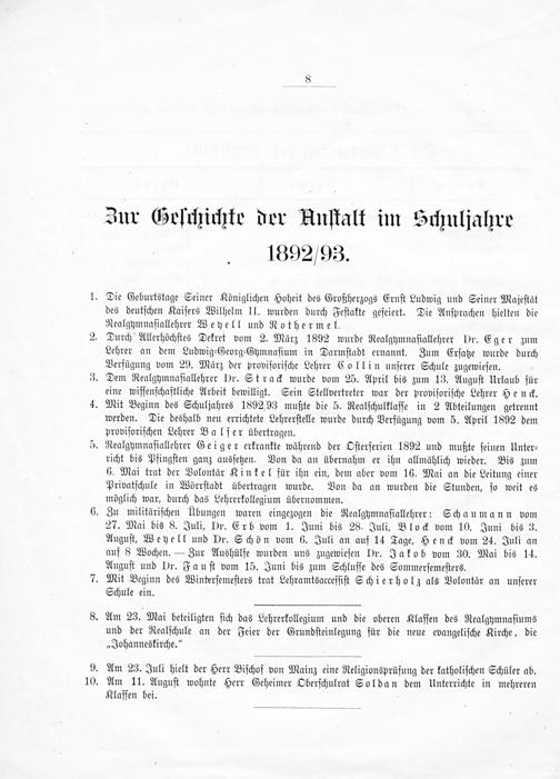 Durch Allerhöchſtes Dekret vom 2. März 1892 wurde Realgymnaſiallehrer Dr. Eger zum Lehrer an dem Ludwig-Georg-Gymnaſium in Darmſtadt ernannt. Zum Erſatze wurde durch Verfügung vom 29. März der proviſoriſche Lehrer Collin unſerer Schule zugewieſen.