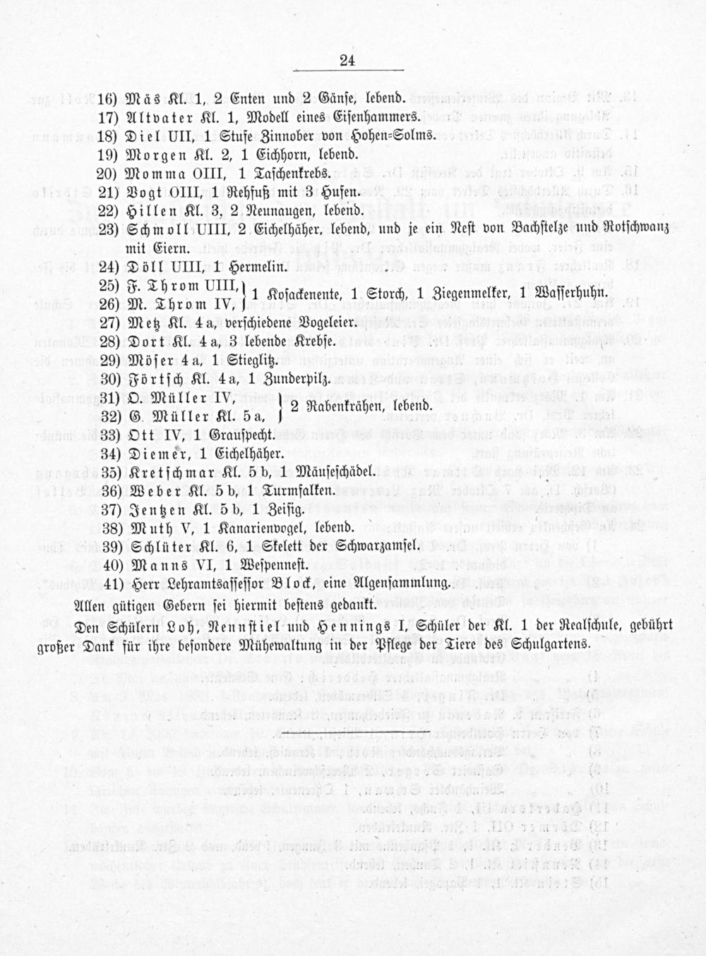 Den Schülern Loh, Nennſtiel und Hennings I, Schüler der Kl. 1 der Realſchule, gebührt großer Dank für ihre beſondere Mühewaltung in der Pflege der Tiere des Schulgartens.