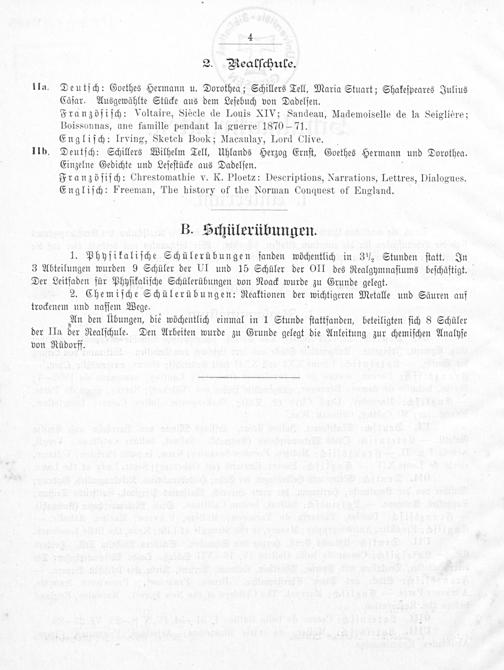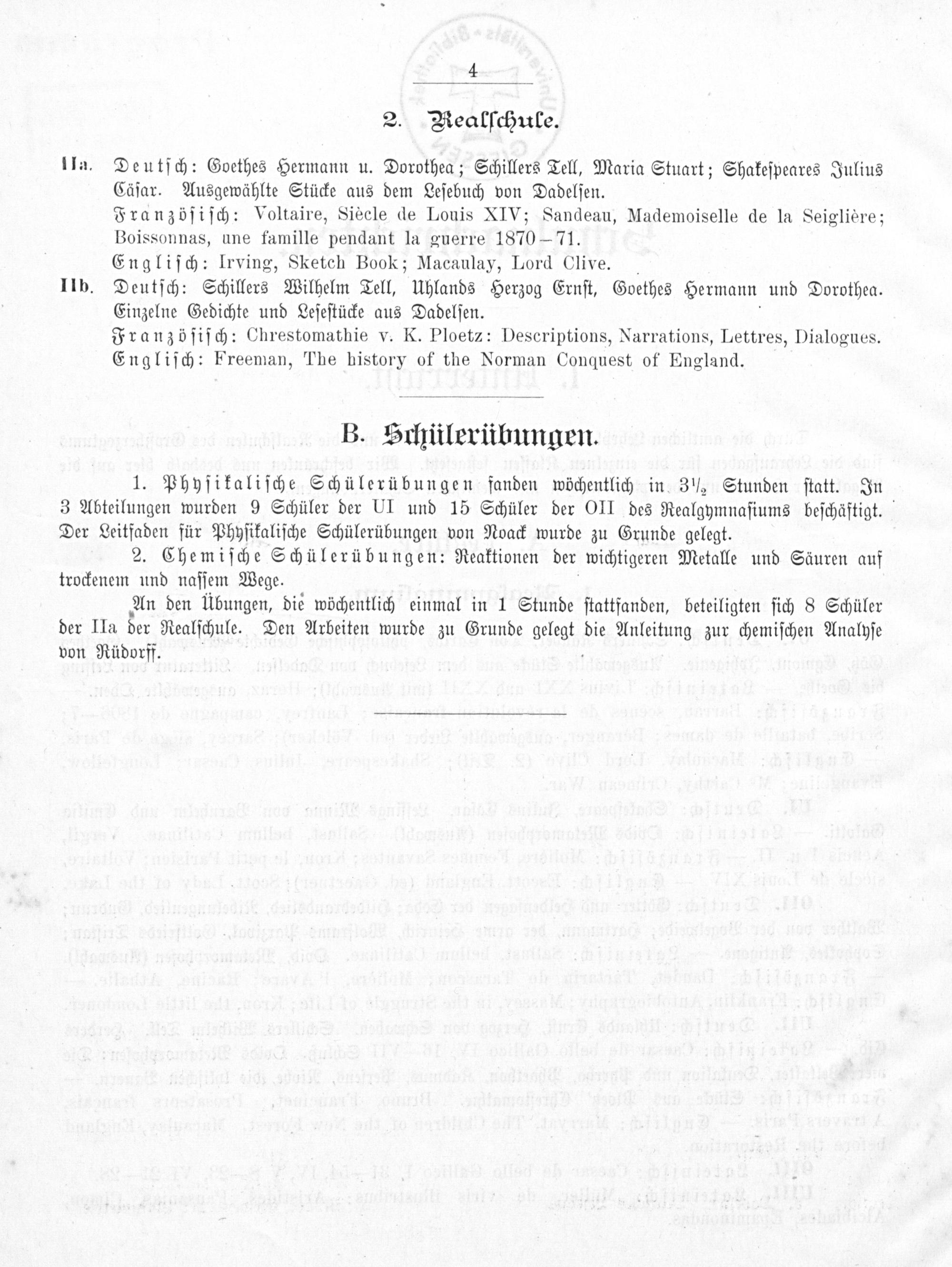 IIa. Deutſch: Goethes Hermann u. Dorothea; Schillers Tell, Maria Stuart; Shakeſpeares Julius Cäſar. Ausgewählte Stücke aus dem Leſebuch von Dadelſen. Franzöſiſch: Voltaire, Siéècle de Louis XIV; Sandeau, Mademoiselle de la Seiglière; Boissonnas, une famille pendant la guerre 1870— 71. Engliſch: Irving, Sketch Book; Macaulay, Lord Clive.