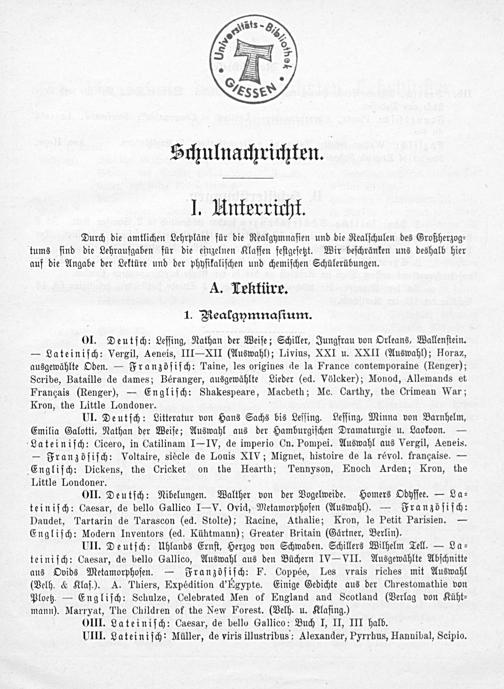 0I. Deutſch: Leſſing, Nathan der Weiſe; Schiller, Jungfrau von Orleans, Wallenſtein. — Lateiniſch: Vergil, Aeneis, III— XII(Auswahl); Livius, XXI u. XXII(Auswahl); Horaz, ausgewählte Oden.— Franzöſiſch: Taine, les origines de la France contemporaine(Renger); Scribe, Bataille de dames; Béranger, ausgewählte Lieder(ed. Völcker); Monod, Allemands et- Français(Renger),— Engliſch: Shakespeare, Macbeth; Mc. Carthy, the Crimean War; Kron, the Little Londoner.