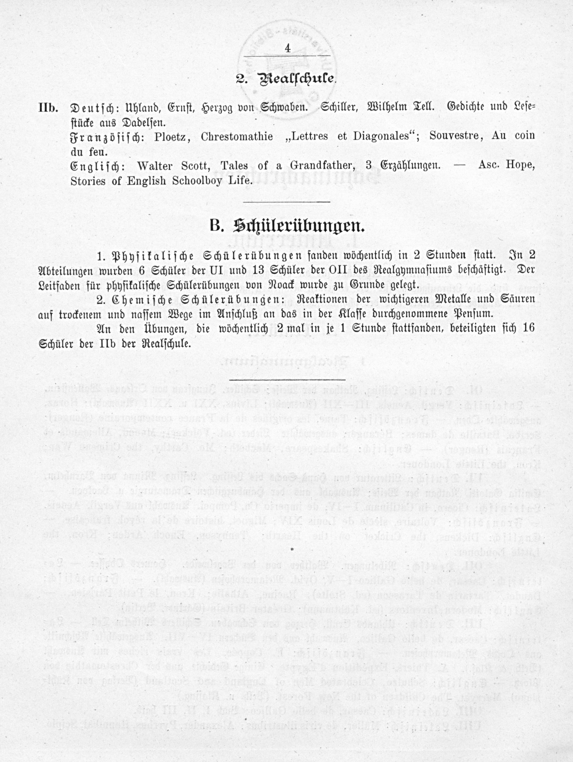 IIb. Deutſch: Uhland, Ernſt, Herzog von Schwaben. Schiller, Wilhelm Tell. Gedichte und Leſe⸗ ſtücke aus Dadelſen. Franzöſiſch: Ploetz, Chrestomathie„Lettres et Diagonales“; Souvestre, Au coin du feu. Engliſch: Walter Scott, Tales of a Grandfather, 3 Erzählungen.— Asc. Hope, Stories of English Schoolboy Life.