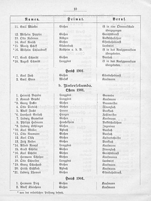 Namen. Heimat. Beruj. 11. Emil Münker Gießen iſt in eine Oberrealſchule übergegangen 12. Wilhelm Peppler Gießen Gerichtsdienſt 13. Otto Rabenau Rödgen Volksſchullehrer 14. Karl Reuſch Gießen Eiſenbahndienſt *15 Moritz Schiff Gladenbach Landwirt 16. Wilhelm Schlaudraff Rodheim a. d. B. iſt in das Realgymnaſium übergetreten. * 17. Ernſt Schmidt Gießen Baufach * 18. Auguſt Schmidt Langgöns iſt in das Realgymnaſium übergetreten. 1 Herbſt 1901. 1. Karl Fach Gießen Eiſenbahndienſt 2. Emil Stern Wieſeck Kaufmann b. Anterſekunda. . Oſtern 1901. 1. Heinrich Beppler Langgöns Geometer 2. Konrad Brückel Langgöns Kaufmann *3. Georg Decker Gießen Braumeiſter 4. Otto Dietrich Gießen Finanzfach 5. Adolf Fuchs Hanau Bankfach *6. Leonhard Gerlach Hungen Zahlmeiſter 7. Ludwig Gravelius Gießen Kaufmann 8. Philipp Hofmann Heuchelheim Volksſchullehrer *9. Ludwig Köhlinger Gießen Ingenieur *10. Karl Müller Atzbach Baufach *11. Otto Neumann Gießen Baufach 12. Karl Ohly Gießen Kulturtechniker 13. Fritz Reiber Gießen Bankfach *14. Alfred Rompf Langgöns Kaufmann 15. Ernſt Schäfer Gießen Finanzfach *16. Karl Schäfer Gießen Gerichtsdienſt 17. Hermann Schelper Gießen Kaufmannn 18. Otto Schneider Langgöns Landwirt *19. Georg Schuchard Gießen Kaufmann 20. Hirſch Süßkind Atzbach Kaufmann *21. Ludwig Thomas Gießen Eiſenbahndienſt. Herbſt 1901. 1. Hermann Dietz Gießen Kaufmann 2. Adolf Kleinhenn Gießen Kaufmann