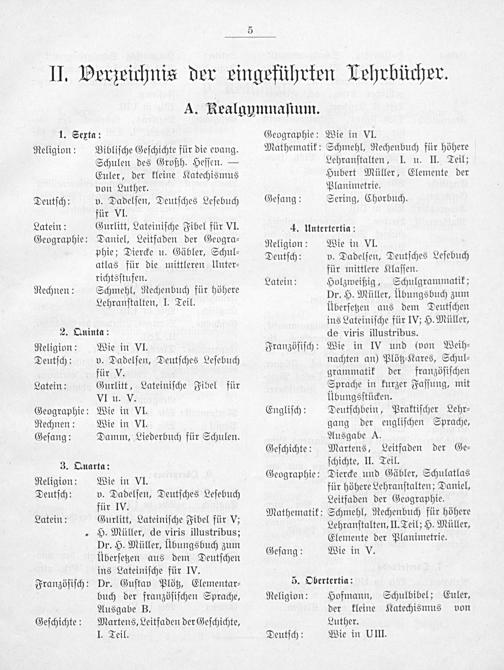 Diercke und Gäbler, Schulatlas für höhere Lehranſtalten; Daniel, Leitfaden der Geographie. Schmehl, Rechenbuch für höhere Lehranſtalten, II. Teil; H. Müller, Elemente der Planimetrie.