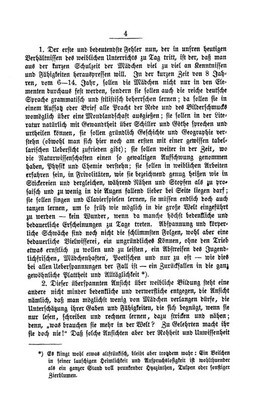 1. Der erſte und bedeutendſte Fehler nun, der in unſren heutigen Verhältniſſen des weiblichen Unterrichts zu Tag tritt, iſt der, daß man aus der kurzen Schulzeit der Mädchen viel zu viel an Kenntniſſen und Fähigkeiten herauspreſſen will. In der kurzen Zeit von 8 Jah⸗ ren, vom 6—14. Jahr, ſollen die Mädchen nicht nur in den Ele⸗ menten durchaus feſt werden, ſondern ſie ſollen auch die reiche deutſche Sprache grammatiſch und ſtiliſtiſch beherrſchen lernen; da ſollen ſie in einem Aufſatz oder Brief alle Pracht der Rede und des Bilderſchmucks womöglich über eine Mondlandſchaft ausgießen; ſie ſollen in der Lite⸗ ratur natürlich mit Gewandtheit über Schiller und Göthe ſprechen und urtheilen können, ſie ſollen gründlich Geſchichte und Geographie ver⸗ ſtehn(obwohl man ſich hier noch am erſten mit einer gewiſſen tabel⸗ lariſchen Ueberſicht zufrieden gibt); ſie ſollen weiter in der Zeit, wo die Naturwiſſenſchaften einen ſo gewaltigen Aufſchwung genommen haben, Phyſik und Chemie verſtehn; ſie ſollen in weiblichen Arbeiten erfahren ſein, in Frivolitäten, wie ſie bezeichnend genug heißen wie in Stickereien und dergleichen, während Nähen und Stopfen als zu pro⸗ ſaiſch und zu wenig in die Augen fallend lieber bei Seite liegen darf; ſie ſollen ſingen und Clavierſpielen lernen, ſie müſſen endlich doch auch tanzen lernen, um ſo früh wie möglich in die große Welt eingeführt zu werden— kein Wunder, wenn da manche höchſt bedenkliche und bedauerliche Erſcheinungen zu Tage treten. Abſpanuung und körper⸗ liche Schwäche ſind noch nicht die ſchlimmſten Folgen, wohl aber eine bedauerliche Vielwiſſerei, ein ungründliches Können, ohne den Trieb etwas ernſtlich zu wollen und zu leiſten, ein Abſtreifen des Jugend⸗ lichfriſchen, Mädchenhaften, Poetiſchen und nur zu oft— wie dies bei allen Ueberſpannungen der Fall iſt— ein Zurückfallen in die ganz gewöhnliche Plattheit und Alltäglichkeit*).
