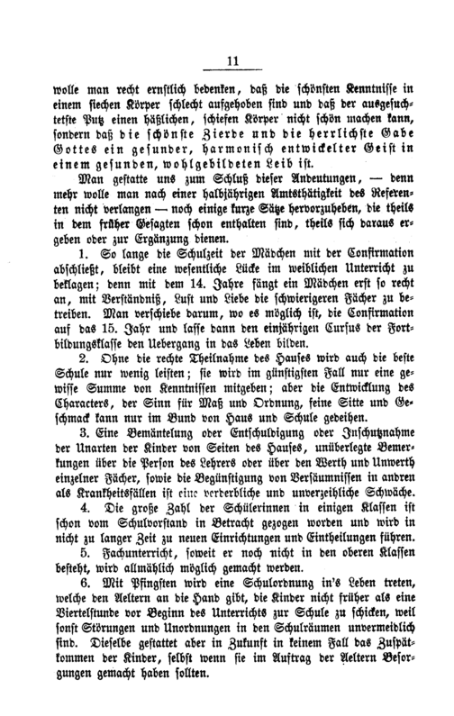 1. So lange die Schulzeit der Mädchen mit der Confirmation abſchließt, bleibt eine weſentliche Lücke im weiblichen Unterricht zu beklagen; denn mit dem 14. Jahre fängt ein Mädchen erſt ſo recht an, mit Verſtändniß, Luſt und Liebe die ſchwierigeren Fächer zu be⸗ treiben. Man verſchiebe darum, wo es möglich iſt, die Confirmation auf das 15. Jahr und laſſe dann den einjährigen Curſus der Fort⸗ bildungsklaſſe den Uebergang in das Leben bilden.