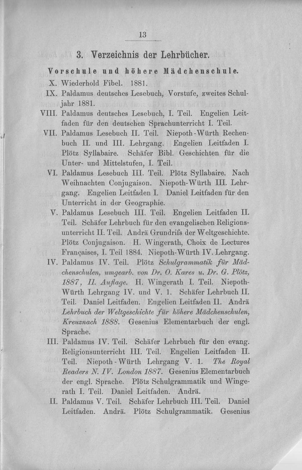 Teil. Schäfer Lehrbuch für den evangelischen Religions- unterricht II. Teil. Andrä Grundriſs der Weltgeschichte. Plötz Conjugaison. H. Wingerath, Choix de Lectures Françaises, I. Teil 1884. Niepoth-Würth IV. Lehrgang. Paldamus IV. Teil. Plötz Schulgrammatile für Mäd- chenschulen, umgearb. von Dr. O. Kares u. Dr. G. Plötz, 167, I. Auflage. H. Wingerath I. Teil. Niepoth- Würth Lehrgang IV. und V. 1. Schäfer Lehrbuch II. Teil. Daniel Leitfaden. Engelien Leitfaden II. Andrä Lehrbuch der Weltgeschichte für höhere Mädchenschulen, Kreuznach 1666. Gesenius Elementarbuch der engl. Sprache.