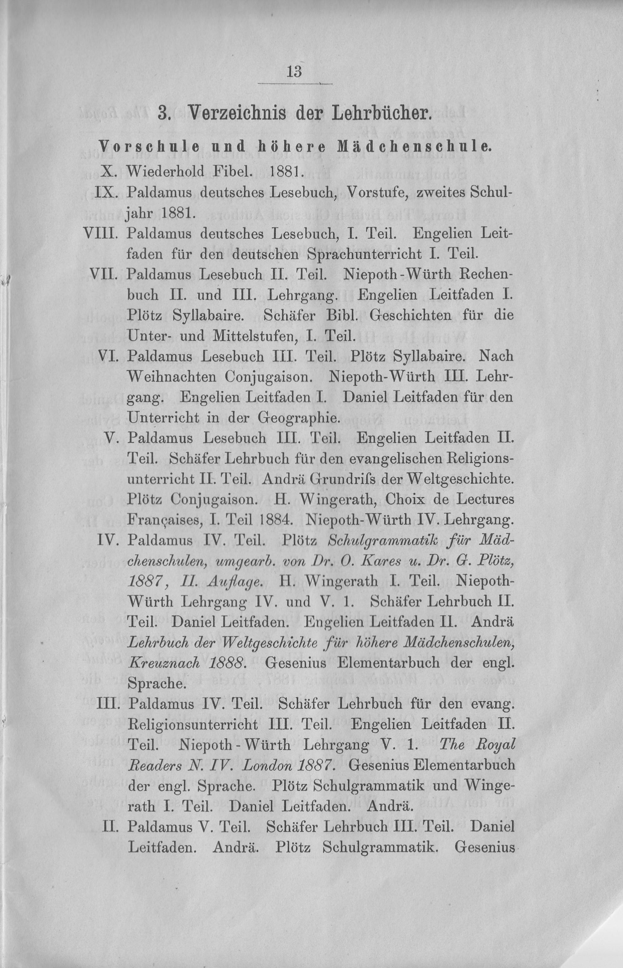 Paldamus deutsches Lesebuch, I. Teil. Engelien Leit- faden für den deutschen Sprachunterricht I. Teil. Paldamus Lesebuch II. Teil. Niepoth-Würth Rechen- buch II. und III. Lehrgang. Engelien Leitfaden I. Plötz Syllabaire. Schäfer Bibl. Geschichten für die Unter- und Mittelstufen, I. Teil.