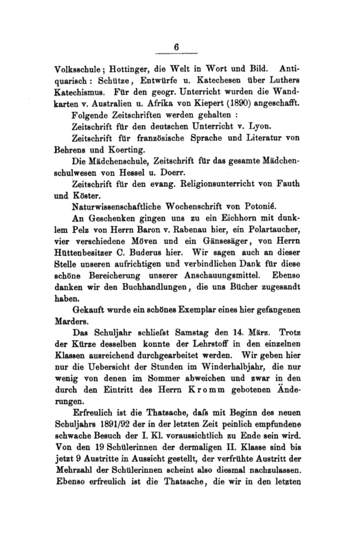 Volksschule; Hottinger, die Welt in Wort und Bild. Anti- quarisch: Schütze, Entwürfe u. Katechesen über Luthers Katechismus. Für den geogr. Unterricht wurden die Wand- karten v. Australien u. Afrika von Kiepert(1890) angeschafft.