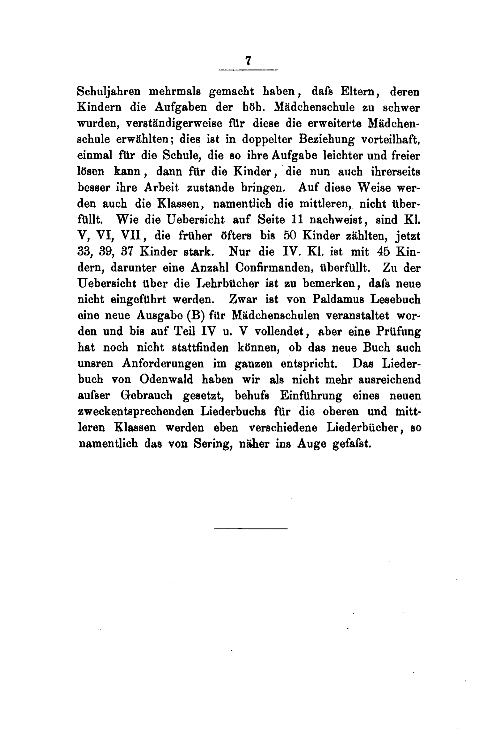 Schuljahren mehrmals gemacht haben, daſs Eltern, deren Kindern die Aufgaben der höh. Mädchenschule zu schwer wurden, verständigerweise für diese die erweiterte Mädchen- schule erwählten; dies ist in doppelter Beziehung vorteilhaft, einmal für die Schule, die so ihre Aufgabe leichter und freier lösen kann, dann für die Kinder, die nun auch ihrerseits besser ihre Arbeit zustande bringen. Auf diese Weise wer- den auch die Klassen, namentlich die mittleren, nicht über- füllt. Wie die Uebersicht auf Seite 11 nachweist, sind Kl. V, VI, VII, die fruher öfters bis 50 Kinder zählten, jetzt 33, 39, 37 Kinder stark. Nur die IV. Kl. ist mit 45 Kin- dern, darunter eine Anzahl Confirmanden, überfüllt. Zu der Uebersicht über die Lehrbücher ist zu bemerken, daſs neue nicht eingeführt werden. Zwar ist von Paldamus Lesebuch eine neue Ausgabe(B) für Mädchenschulen veranstaltet wor- den und bis auf Teil IV u. V vollendet, aber eine Prüfung hat noch nicht stattfinden können, ob das neue Buch auch unsren Anforderungen im ganzen entspricht. Das Lieder- buch von Odenwald haben wir als nicht mehr ausreichend auſser Gebrauch gesetzt, behufs Einführung eines neuen zweckentsprechenden Liederbuchs für die oberen und mitt- leren Klassen werden eben verschiedene Liederbücher, so namentlich das von Sering, näher ins Auge gefaſst.