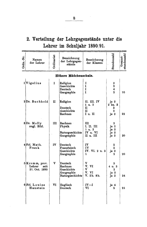 5 2 ich 2 37 2 Namen 8 MBezeichnung Bezeichnung ³5 2 S der Lehrgegen- 8 3 8 der Lehrer 8 ständo der Klassen 5 8 S S 2 8 Höhere Mädchenschule. I Vigelius I Religion I 2 Geschichte 1 2 Deutsch I 4 Geographie I 2 10 2 Dr. Buchhold II Religion II. III. IV je 2 1 u. 2 2 bz. 3 Deutsch II 5 Geschichte II 2 Rechnen I u. II je 2 22 3 Dr. Molly III Rechnen III 2 zugl. Bibl. Physik I. II. III je 2 1 u. 2 je 2 Naturgeschichte IV u. VI je 2 Geographie II u. III je 2 20 4 Frl. Math. IV Deutsch IV 5 Frank Französisch IV 5 Geschichte IV. VI. 2 u. 3 je 2 Geographie 1 2 20 5 Kromm, prov. V Deutsch V 5 Lehrer seit Rechnen V. VI 4 u. 3 21. Oct. 1890 Geschichte V 2 Geographie V. VI je 2 (Naturgeschichte V. 5 b. 8 b je 2 24 6 Frl. Louise VI Englisch IV— I je 4 Hanstein Deutsch VI 5 21