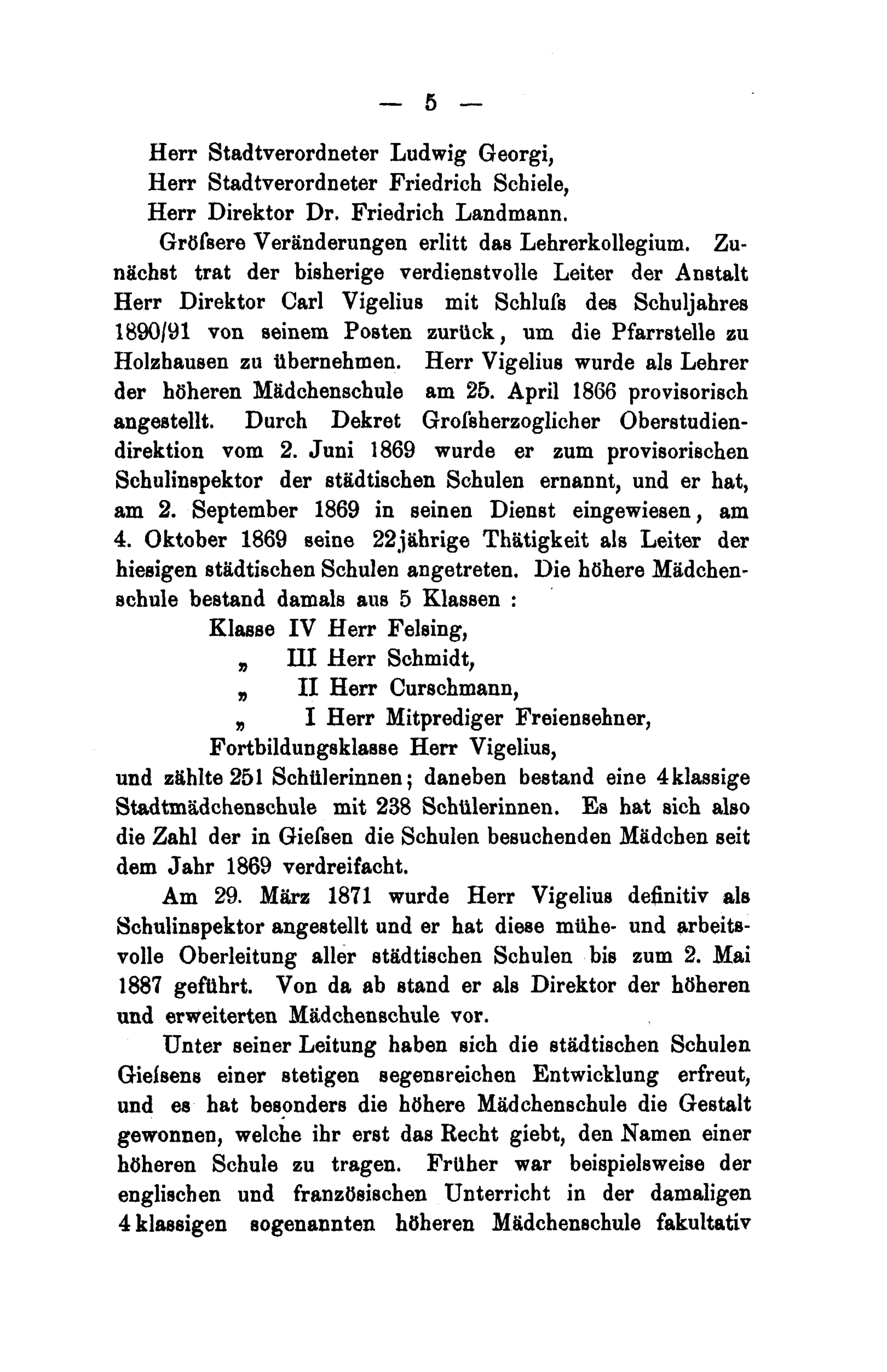 Gröſsere Veränderungen erlitt das Lehrerkollegium. Zu- nächst trat der bisherige verdienstvolle Leiter der Anstalt Herr Direktor Carl Vigelius mit Schluſs des Schuljahres 1890/91 von seinem Posten zurück, um die Pfarrstelle zu Holzhausen zu übernehmen. Herr Vigelius wurde als Lehrer der höheren Mädchenschule am 25. April 1866 provisorisch angestellt. Durch Dekret Groſsherzoglicher Oberstudien- direktion vom 2. Juni 1869 wurde er zum provisorischen Schulinspektor der städtischen Schulen ernannt, und er hat, am 2. September 1869 in seinen Dienst eingewiesen, am 4. Oktober 1869 seine 22 jährige Thätigkeit als Leiter der hiesigen städtischen Schulen angetreten. Die höhere Mädchen- schule bestand damals aus 5 Klassen: