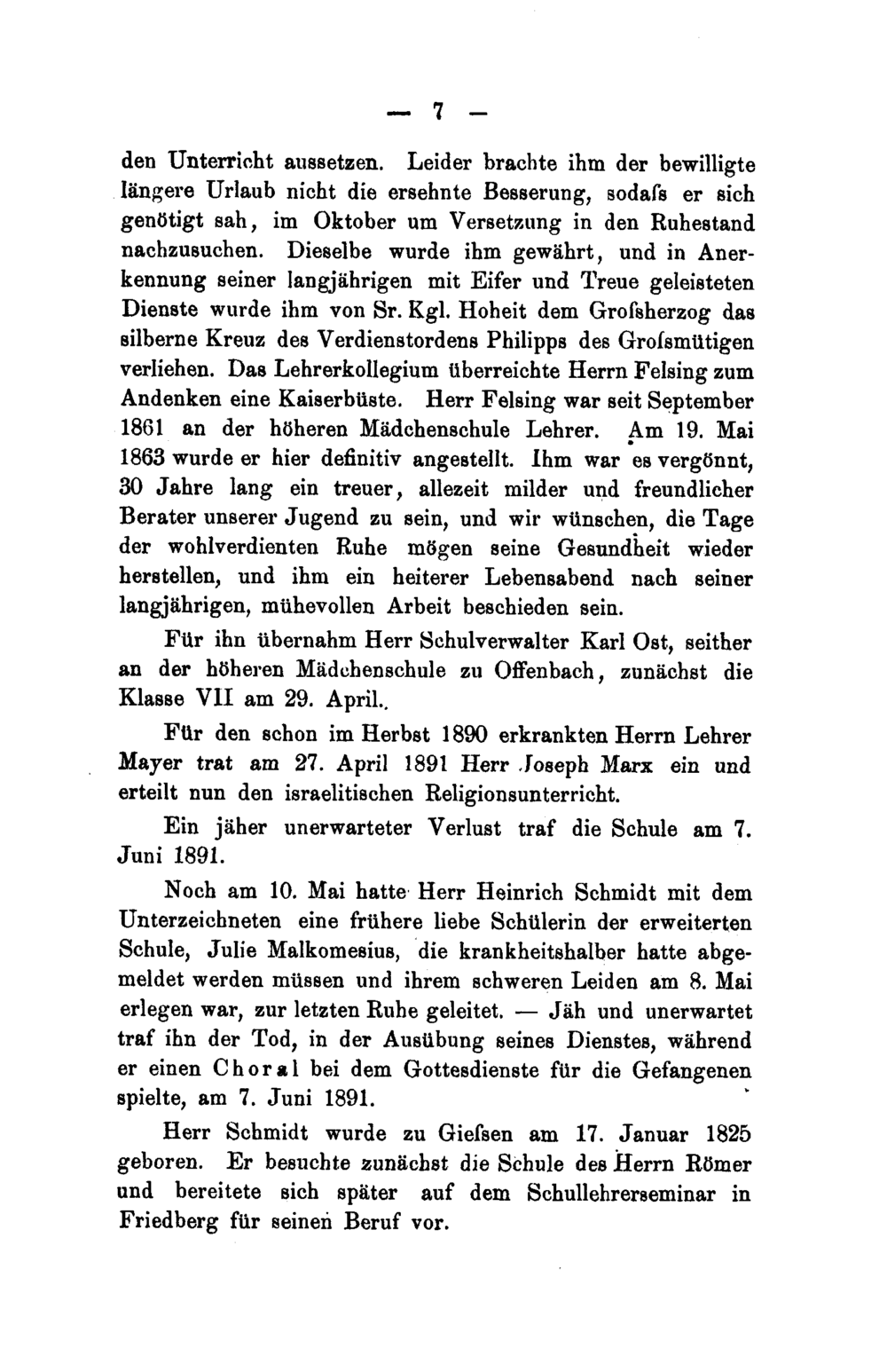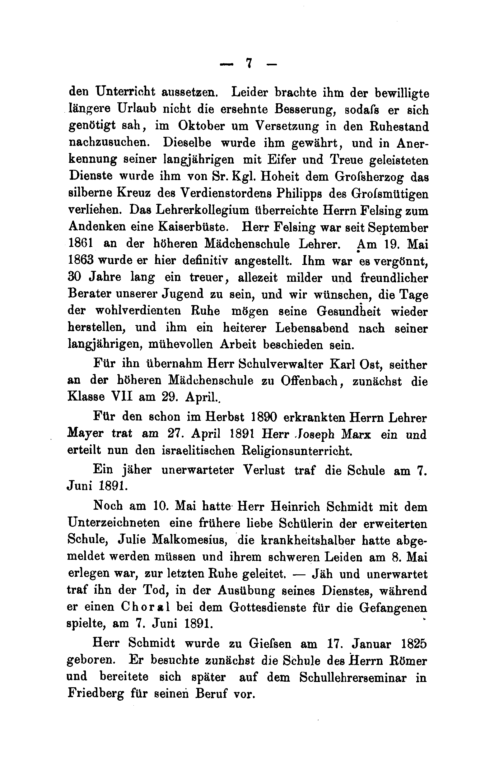 den Unterricht aussetzen. Leider brachte ihm der bewilligte längere Urlaub nicht die ersehnte Besserung, sodaſs er sich genötigt sah, im Oktober um Versetzung in den Ruhestand nachzusuchen. Dieselbe wurde ihm gewährt, und in Aner- kennung seiner langjährigen mit Eifer und Treue geleisteten Dienste wurde ihm von Sr. Kgl. Hoheit dem Groſsherzog das silberne Kreuz des Verdienstordens Philipps des Grofsmütigen verliehen. Das Lehrerkollegium überreichte Herrn Felsing zum Andenken eine Kaiserbüste. Herr Felsing war seit September 1861 an der höheren Mädchenschule Lehrer. Am 19. Mai 1863 wurde er hier definitiv angestellt. Ihm war es vergönnt, 30 Jahre lang ein treuer, allezeit milder und freundlicher Berater unserer Jugend zu sein, und wir wünschen, die Tage der wohlverdienten Ruhe mögen seine Gesundheit wieder herstellen, und ihm ein heiterer Lebensabend nach seiner langjährigen, mühevollen Arbeit beschieden sein.