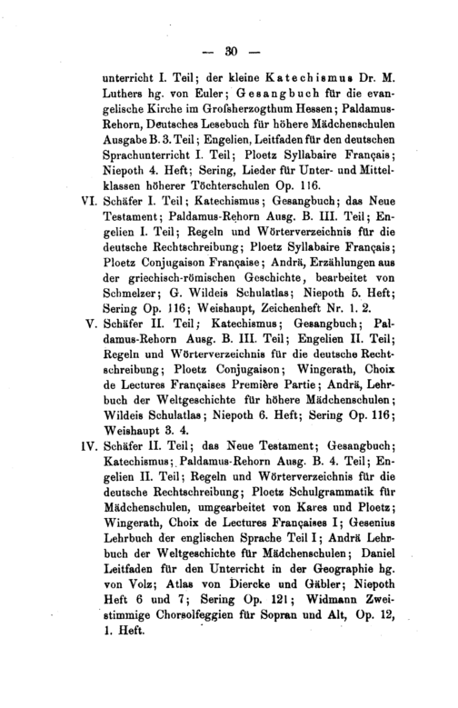 unterricht I. Teil; der kleine Katechismus Dr. M. Luthers hg. von Euler; Gesangbuch für die evan- gelische Kirche im Groſsherzogthum Hessen; Paldamus- Rehorn, Deutsches Lesebuch für höhere Mädchenschulen Ausgabe B. 3. Teil; Engelien, Leitfaden für den deutschen Sprachunterricht I. Teil; Ploetz Syllabaire Français; Niepoth 4. Heft; Sering, Lieder für Unter- und Mittel- klassen höherer Töchterschulen Op. 116.