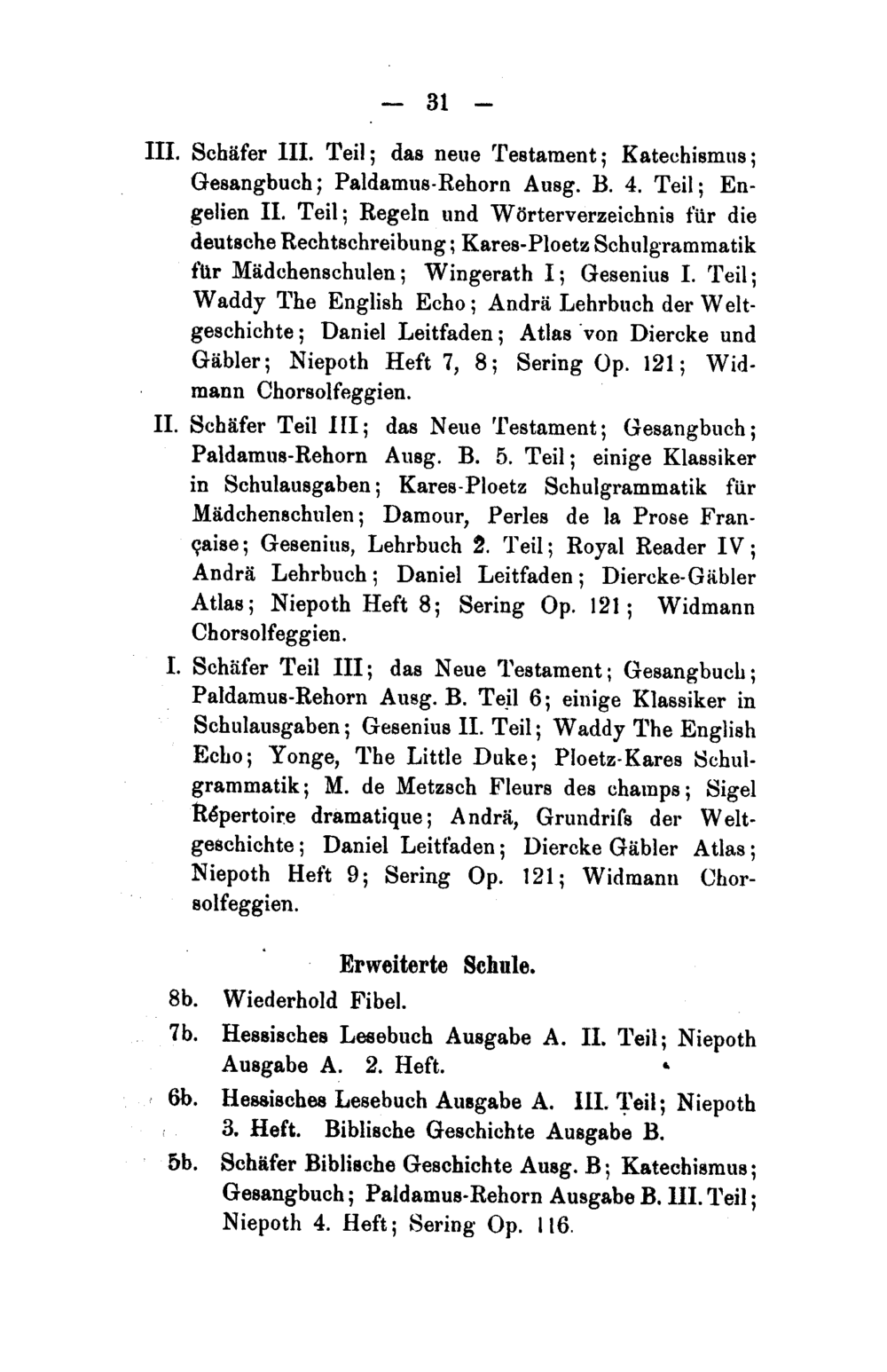 Paldamus-Rehorn Ausg. B. Teil 6; einige Klassiker in Schulausgaben; Gesenius II. Teil; Waddy The English Echo; Yonge, The Little Duke; Ploetz-Kares Schul- grammatik; M. de Metzsch Fleurs des champs; Sigel Répertoire dramatique; Andrä, Grundriſs der Welt- geschichte; Daniel Leitfaden; Diercke Gäbler Atlas; Niepoth Heft 9; Sering Op. 121; Widmann Chor- solfeggien.