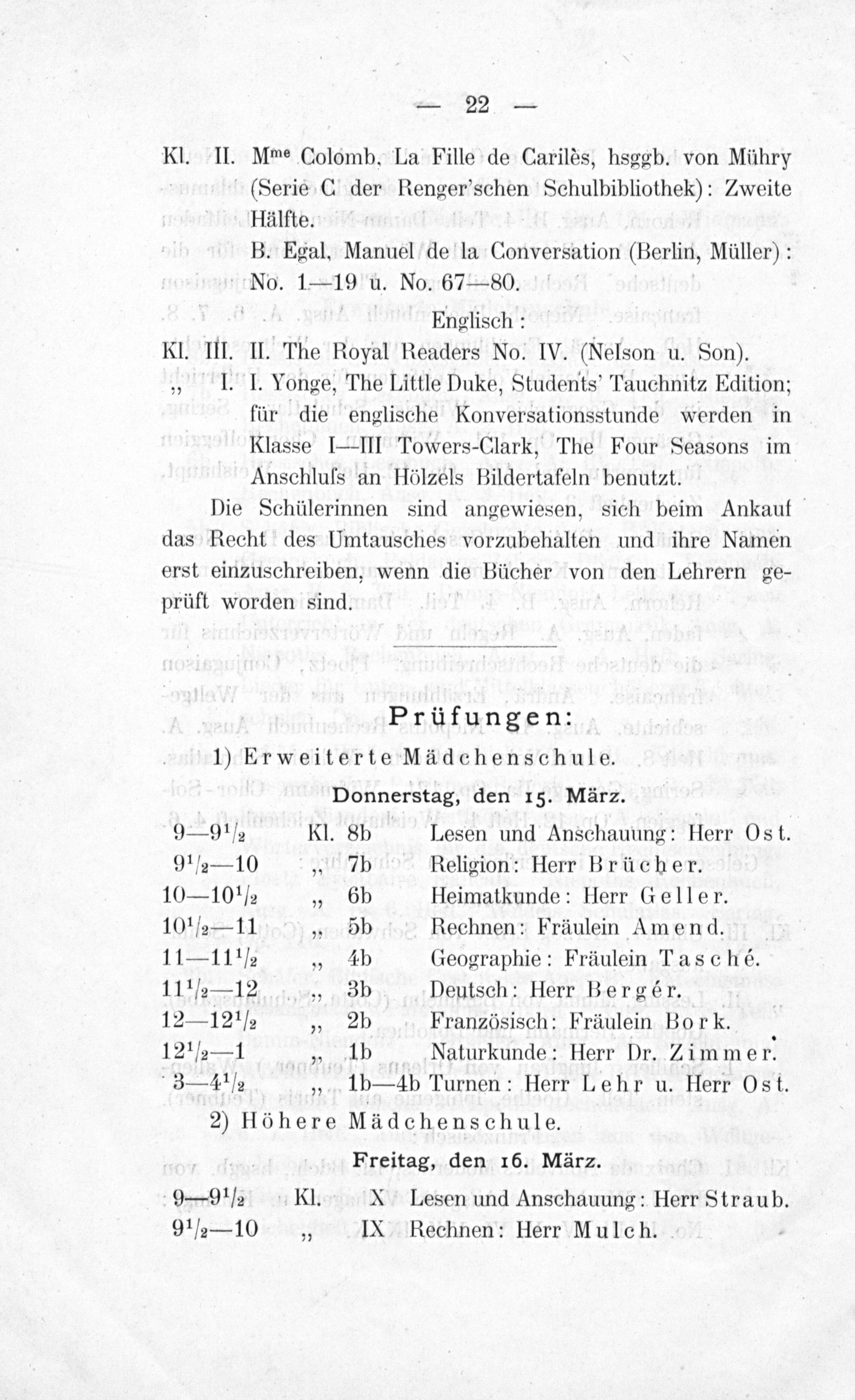 „ I. I. Vonge, The Little Duke, Students' Tauchnitz Edition; für die englische Konversationsstunde werden in Klasse-III Towers-Clark, The Four Seasons im Anschluls an Hölzels Bildertafeln benutzt.