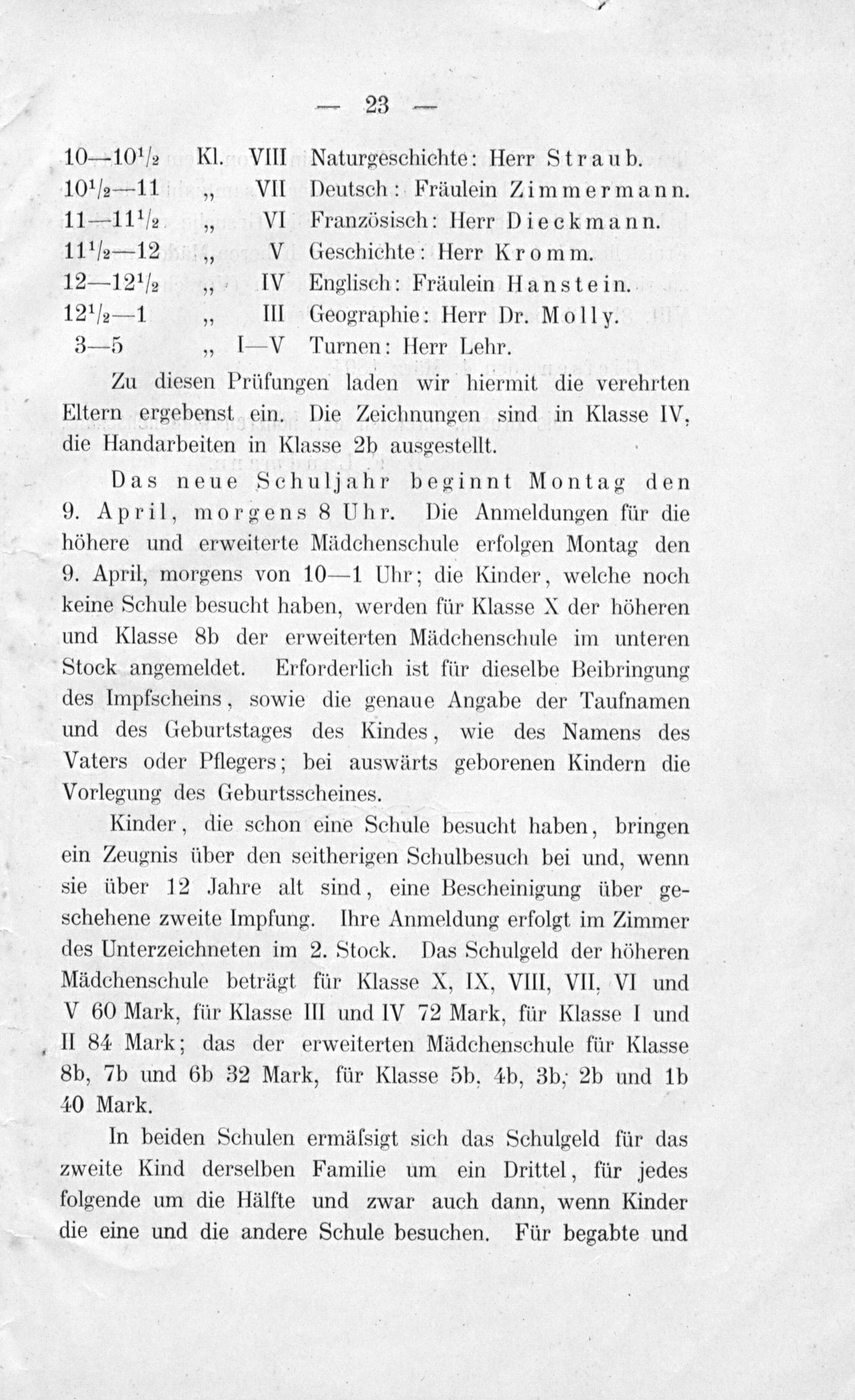 10— 10 ½ Kl. VIII Naturgeschichte: Herr Straub. 10 ½— 11„ VII Deutsch: Fräulein Zimmermann. 11— 11 ½„ VI Französisch: Herr Dieckmann. 11 ½— 12 V Geschichte: Herr Kromm. 12— 12 ½„ IV Englisch: Fräulein Hanstein. 12 ½— 1„ III Geographie: Herr Dr. Molly. 3— 5„ V Turnen: Herr Lehr.
