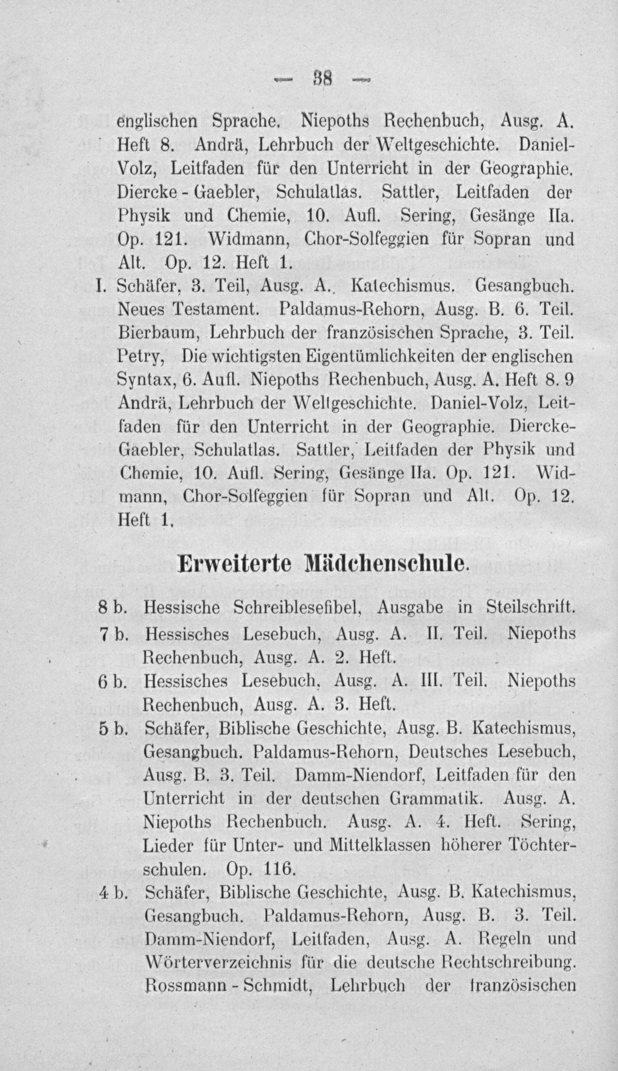 6 b. Hessisches Lesebuch, Ausg. A. III. Teil. Niepoths Rechenbuch, Ausg. A. 3. Heft. 5 b. Schäfer, Biblische Geschichte, Ausg. B. Katechismus, Gesangbuch. Paldamus-Rehorn, Deutsches Lesebuch, Ausg. B. 3. Teil. Damm-Niendorf, Leitfaden für den Unterricht in der deutschen Grammatik. Ausg. A. Niepoths Rechenbuch. Ausg. A. 4. Heft. Sering, Lieder für Unter- und Mittelklassen höherer Töchter- schulen. Op. 116.