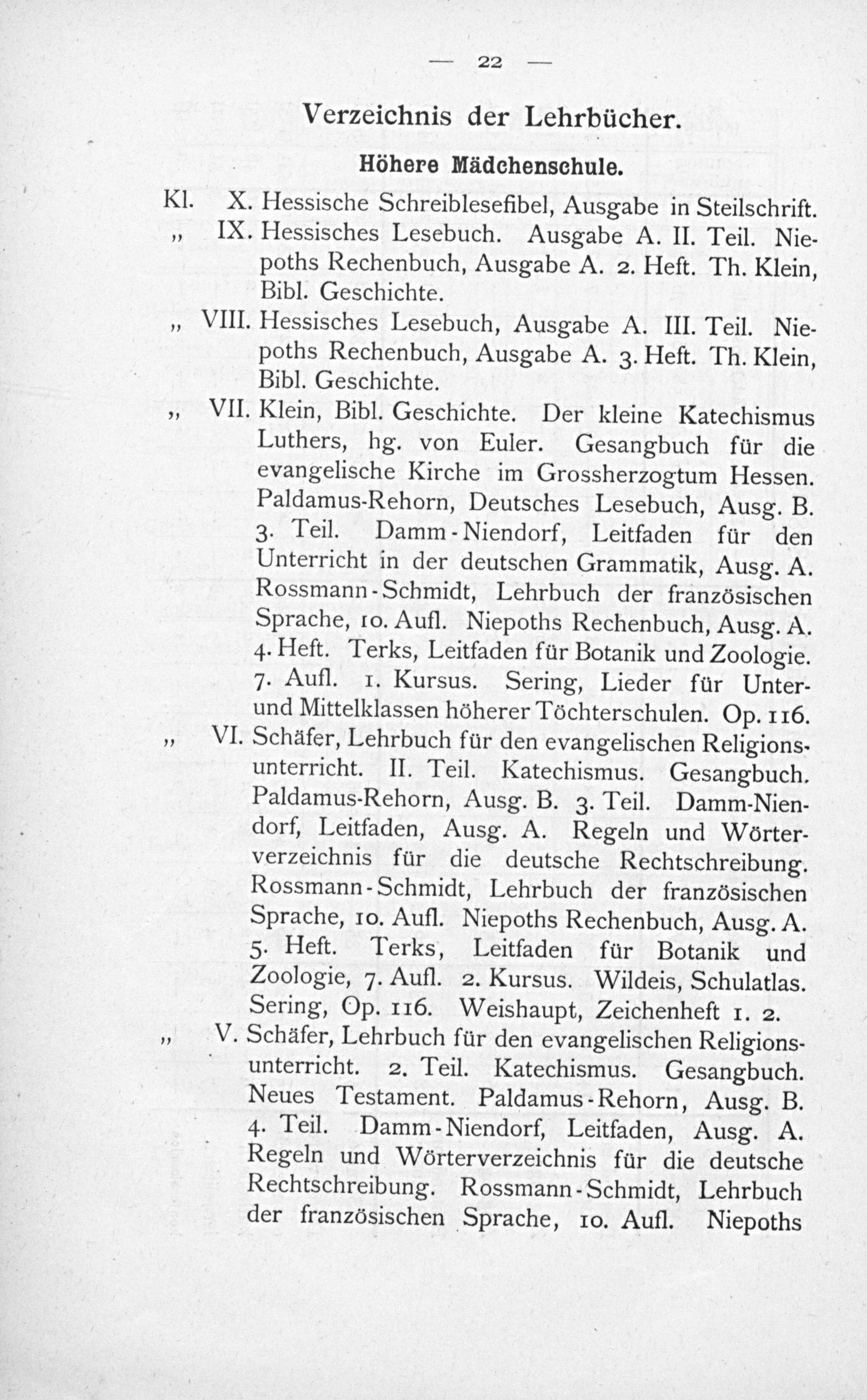 Klein, Bibl. Geschichte. Der kleine Katechismus Luthers, hg. von Euler. Gesangbuch für die evangelische Kirche im Grossherzogtum Hessen. Paldamus-Rehorn, Deutsches Lesebuch, Ausg. B. 3. Teil. Damm-Niendorf, Leitfaden für den Unterricht in der deutschen Grammatik, Ausg. A. Rossmann-Schmidt, Lehrbuch der französischen Sprache, 10. Aufl. Niepoths Rechenbuch, Ausg. A. 4. Heft. Terks, Leitfaden für Botanik und Zoologie. 7. Aufl. 1. Kursus. Sering, Lieder für Unter- und Mittelklassen höherer Töchterschulen. Op. 116. Schaäfer, Lehrbuch füúr den evangelischen Religions- unterricht. II. Teil. Katechismus. Gesangbuch. Paldamus-Rehorn, Ausg. B. 3. Teil. Damm-Nien- dorf, Leitfaden, Ausg. A. Regeln und Worter- verzeichnis für die deutsche Rechtschreibung. Rossmann-Schmidt, Lehrbuch der französischen Sprache, 10. Aufl. Niepoths Rechenbuch, Ausg. A. 5. Heft. Terks, Leitfaden für Botanik und Zoologie, 7. Aufl. 2. Kursus. Wildeis, Schulatlas. Sering, Op. 116. Weishaupt, Zeichenheſt 1. 2.