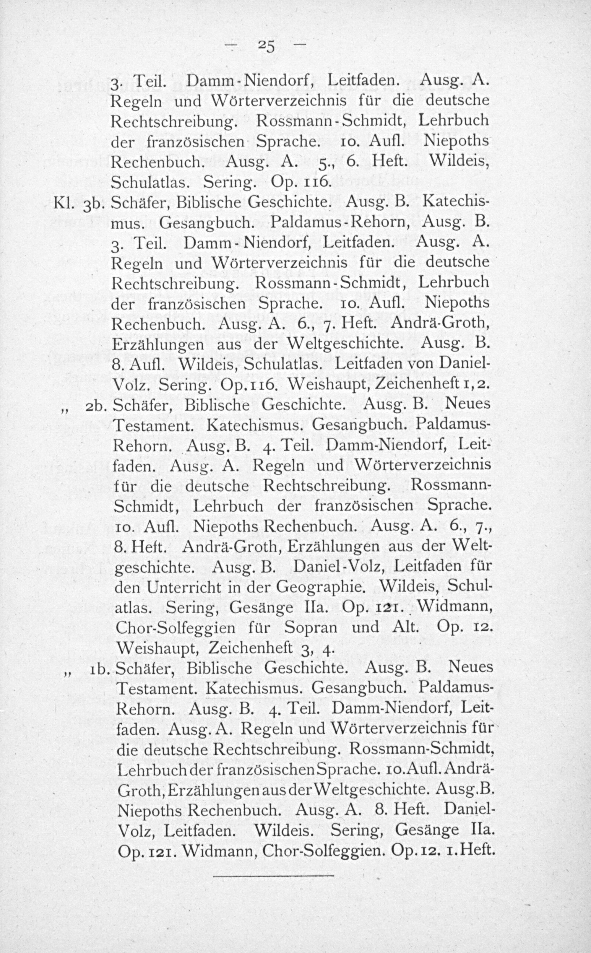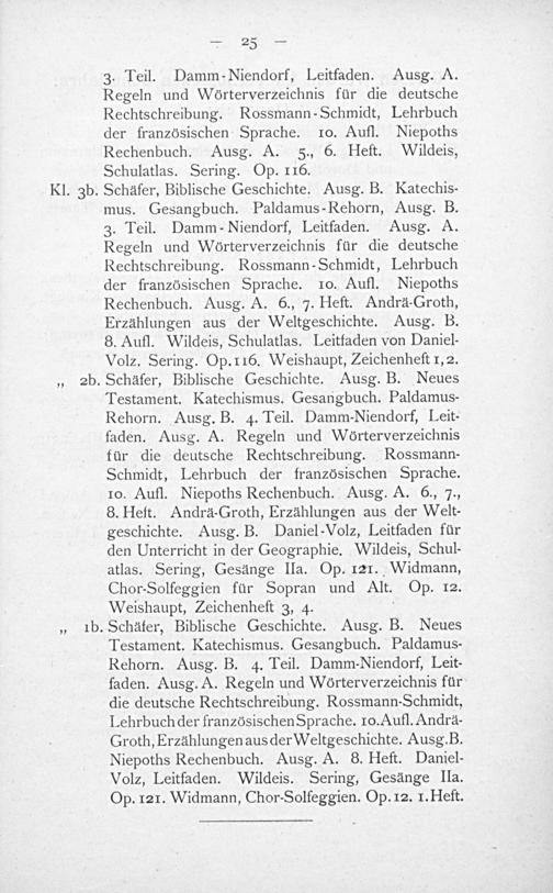 3. Teil. Damm-Niendorf, Leitfaden. Ausg. A. Regeln und Wörterverzeichnis für die deutsche Rechtschreibung. Rossmann-Schmidt, Lehrbuch der französischen Sprache. 10. Aufl. Niepoths Rechenbuch. Ausg. A. 5., 6. Heft. Wildeis, Schulatlas. Sering. Op. 116.