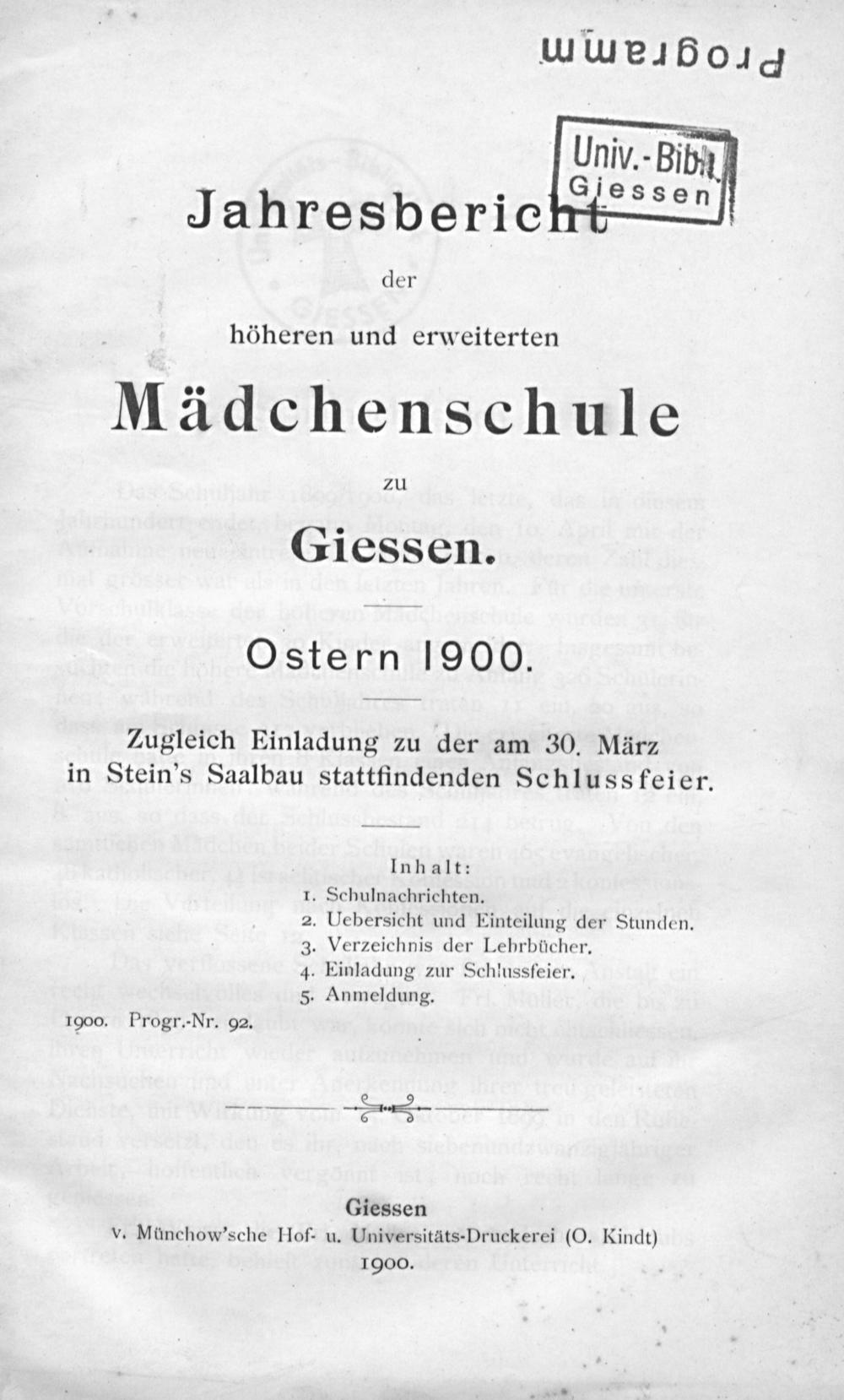 Inhalt: Schulnachrichten. Uebersicht und Einteilung der Stunden. .Verzeichnis der Lehrbücher. .Einladung zur Schlussfeier. . Anmeldung.