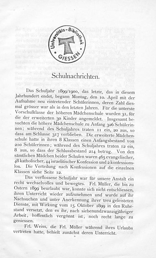 Das verflossene Schuljahr war für unsere Anstalt ein recht wechselvolles und bewegtes. Frl. Müller, die bis zu Ostern 1800 beurlaubt war, konnte sich nicht entschliessen, ihren Unterricht wieder aufzunehmen und wurde auf ihr Nachsuchen und unter Anerkennung ihrer treu geleisteten Dienste, mit Wirkung vom 15. Oktober 18909 in den Ruhe- stand versetzt, den es ihr, nach siebenundzwanzigjähriger Arbeit, hoffentlich vergônnt ist, noch recht lange zu geniessen.