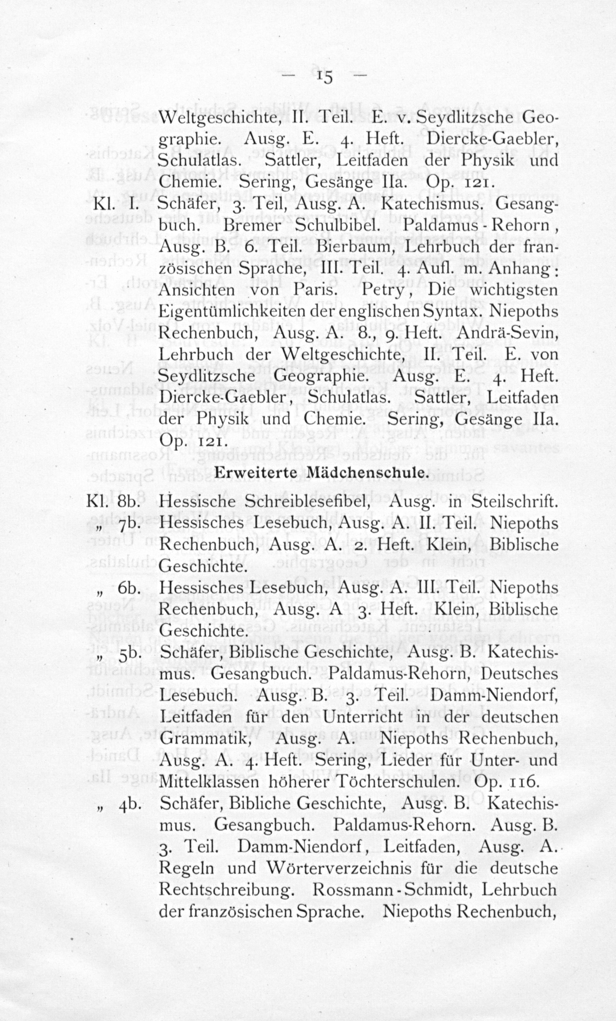 Schäfer, Biblische Geschichte, Ausg. B. Katechis- mus. Gesangbuch. Paldamus-Rehorn, Deutsches Lesebuch. Ausg. B. 3. Teil. Damm-Niendorf, Leitfaden für den Unterricht in der deutschen Grammatik, Ausg. A. Niepoths Rechenbuch, Ausg. A. 4. Heſt. Sering, Lieder für Unter- und Mittelklassen höherer Töchterschulen. Op. 116. Schäfer, Bibliche Geschichte, Ausg. B. Katechis- mus. Gesangbuch. Paldamus-Rehorn. Ausg. B. 3. Teil. Damm-Niendorf, Leitfaden, Ausg. A. Regeln und Wörterverzeichnis für die deutsche Rechtschreibung. Rossmann-Schmidt, Lehrbuch der französischen Sprache. Niepoths Rechenbuch,