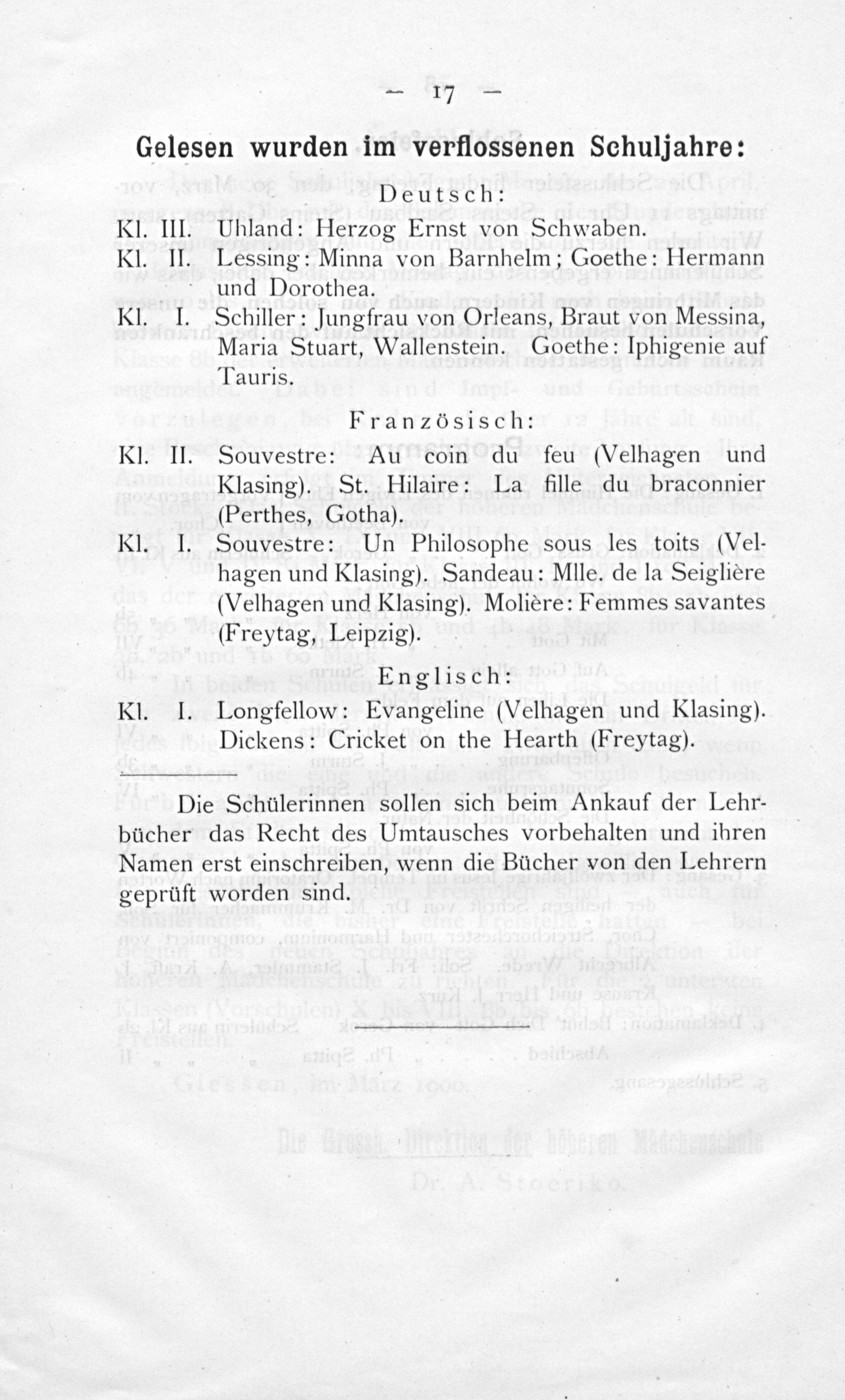 Französisch: Souvestre: Au coin du feu(Velhagen und Klasing). St. Hilaire: La fille du braconnier (Perthes, Gotha). Souvestre: Un Philosophe sous les toits NVel- hagen und Klasing). Sandeau: Mlle. de la Seiglière (Velhagen und Klasing). Molière: Femmes savantes (Freytag, Leipzig).