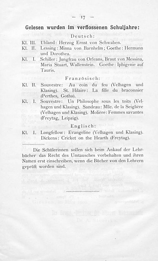 Die Schülerinnen sollen sich beim Ankauf der Lehr- bücher das Recht des Umtausches vorbehalten und ibren Namen erst einschreiben, wenn die Bücher von den Lehrern geprüft worden sind.