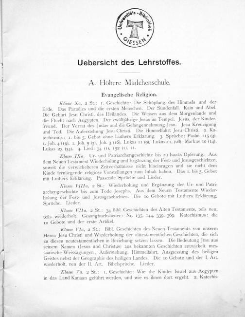 Klasse Xa, 2 St.: 1. Geschichte: Die Schöpfung des Himmels und der Erde. Das Paradies und die ersten Menschen. Der Sündenfall. Kain und Abel. Die Geburt Jesu Christi, des Heilandes. Die Weisen aus dem Morgenlande und die Flucht nach Aegypten. Der zwolfjährige Jesus im Tempel. Jesus, der Kinder- freund. Der Verrat des Judas und die Gefangennehmung Jesu. Jesu Kreuzigung und Tod. Die Auferstehung Jesu Christi. Die Himmelfahrt Jesu Christi. 2. Ka- techismus: I. bis 5. Gebot ohne Luthers Erklärung. 3. Sprüche: Psalm 113(3), 1. Joh. 4(10), 1. Joh. 5(3), Joh. 3(16), Lukas 11(O), Lukas 11,(28), Markus 10(14, Lukas 23(34). 4. Lied: 34(1), 152(1), I1.