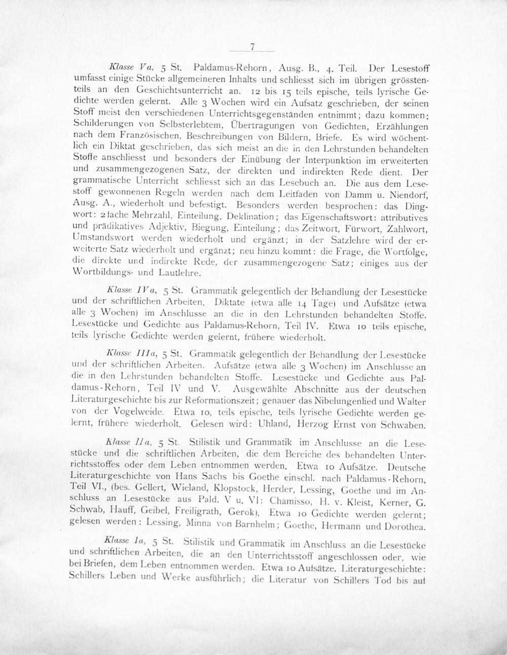 Klasse Ia, 5 St. Stilistik und Grammatik im Anschluss an die Lesestücke und schriftlichen Arbeiten, die an den Unterrichtsstoff angeschlossen oder, wie bei Brieſen, dem Leben entnommen werden. Etwa 10 Aufsätze. Literaturgeschichte: Schillers Leben und Werke ausführlich; die Literatur von Schillers Tod bis autf