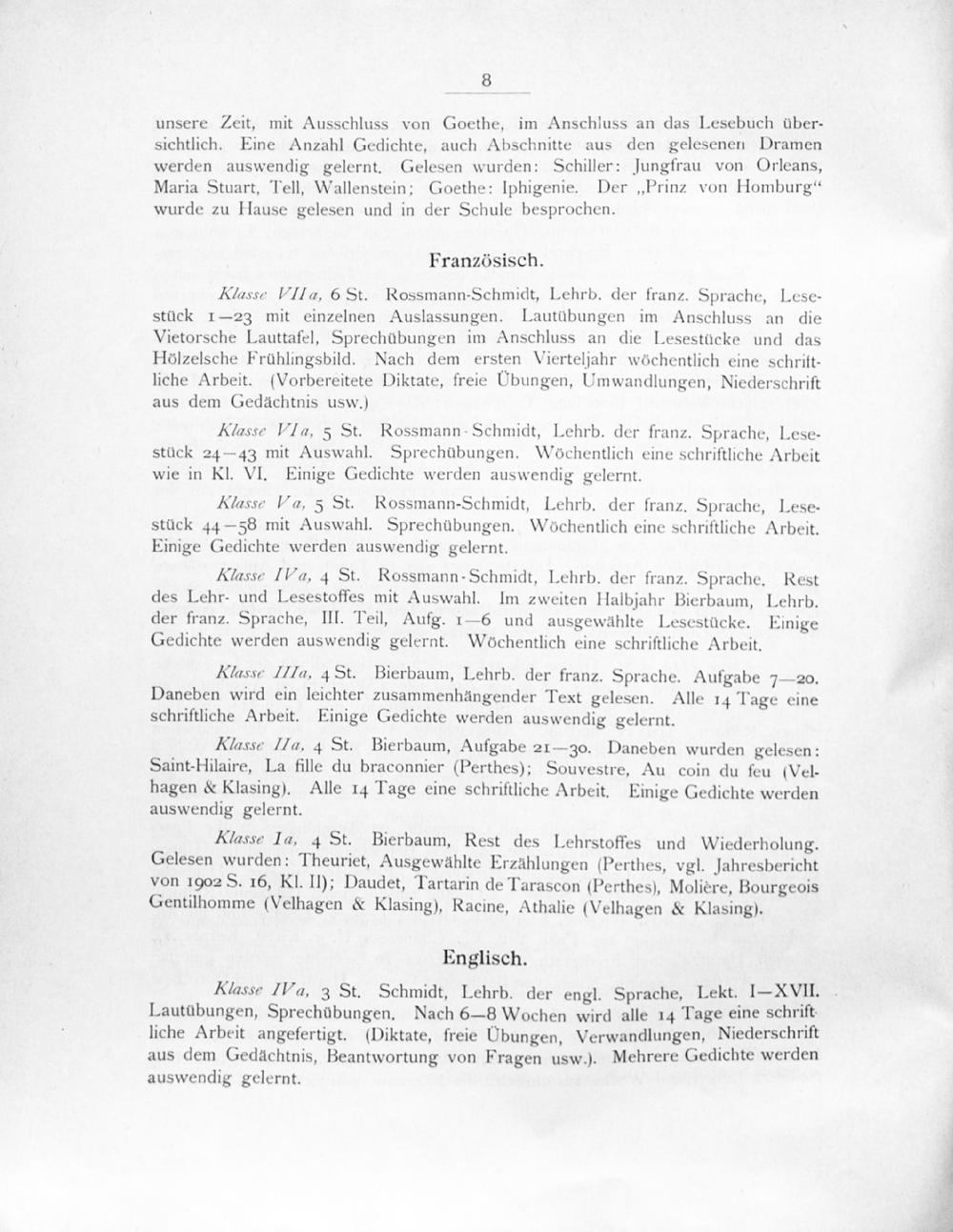 Klasse Ia, 4 St. Bierbaum, Rest des Lehrstoffes und Wiederholung. Gelesen wurden: Theuriet, Ausgewählte ErzÄhlungen(Perthes, vgl. Jahresbericht von 1902 S. 16, Kl. II); Daudet, Tartarin de Tarascon(Perthes), Molière, Bourgeois Gentilhomme(Velhagen& Klasing), Racine, Athalie(Velhagen&X Klasing).