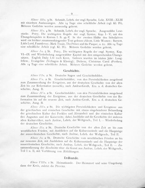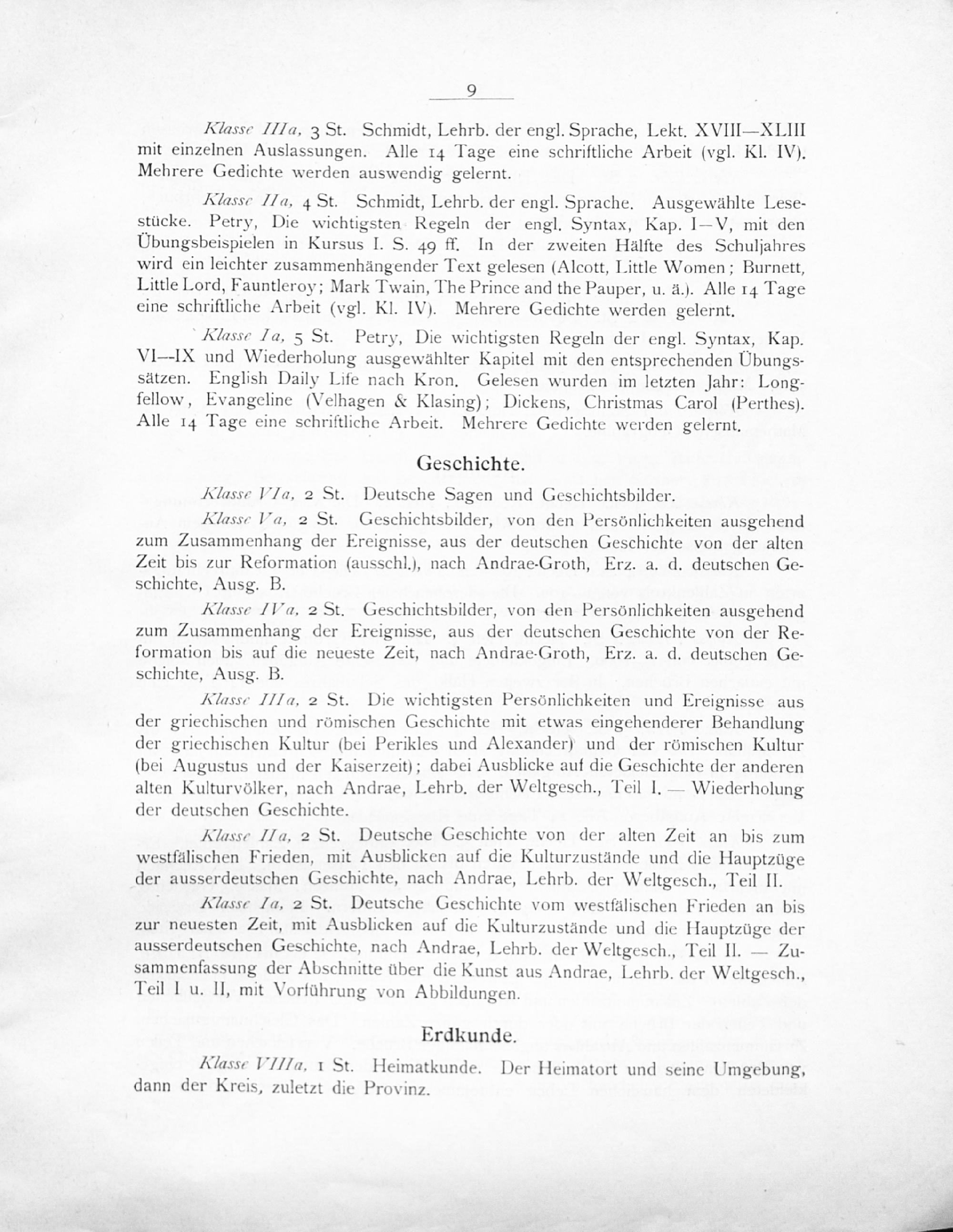 Klasse IIa. 2 St. Die wichtigsten Persönlichkeiten und Ereignisse aus der griechischen und römischen Geschichte mit etwas eingehenderer Behandlung der griechischen Kultur(bei Perikles und Alexander) und der rõmischen Kultur (bei Augustus und der Kaiserzeit); dabei Ausblicke auf die Geschichte der anderen alten Kulturvölker, nach Andrae, Lehrb. der Weltgesch., Teil I.— Wiederholung der deutschen Geschichte.