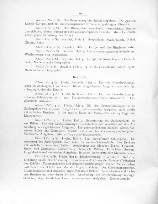Klasse IIlla. 4 St. Hecht, Heſt 3. Die vier Grundrechnungsarten im Zahlengebiet von 1—1000. Eingekleidete und vermischte Aufgaben, auch solche mit einfachen Bruchen. In der zweiten Halfte des Schuljahres alle 14 Tage eine Klassenarbeit.