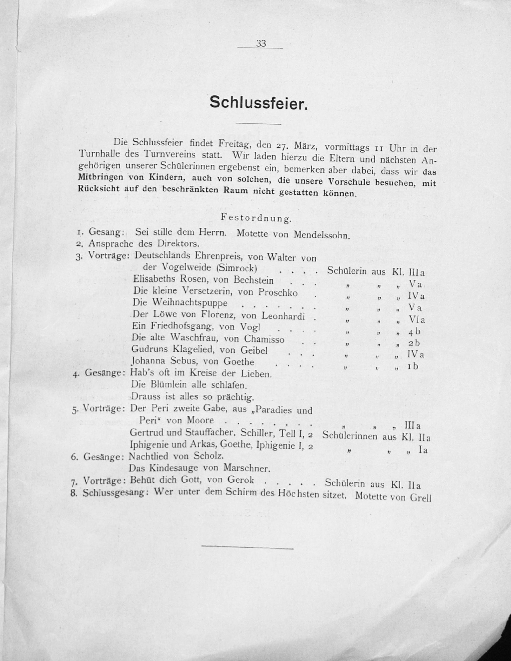 Die Schlussfeier findet Freitag, den 27. Marz, vormittags II Uhr in der Turnhalle des Turnvereins statt. Wir laden hierzu die Eltern und nächsten An- gehörigen unserer Schülerinnen ergebenst ein, bemerken aber dabei, dass wir das Mitbringen von Kindern, auch von solchen, die unsere Vorschule besuchen, mit Rücksicht auf den beschränkten Raum nicht gestatten können.