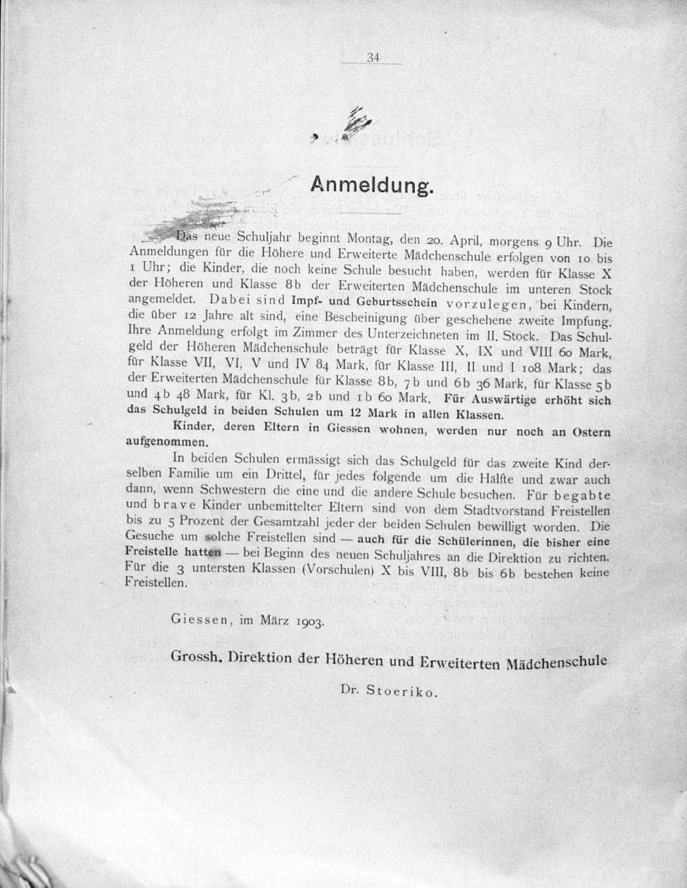 as neue Schuljahr beginnt Montag, den 20. April, morgens Uhr. Die Anmeldungen für die Höhere und Erweiterte Mädchenschule erfolgen von 1o0 bis 1 Uhr; die Kinder, die noch keine Schule besucht haben, werden für Klasse X der Hoöheren und Klasse 8 b der Erweiterten Mädchenschule im unteren Stock angemeldet. Dabei sind Impf- und Geburtsschein vorzulegen, bei Kindern, die über 12 Jahre alt sind, eine Bescheinigung über geschehene zweite lmpfung. Ihre Anmeldung erfolgt im Zimmer des Unterzeichneten im II. Stock. Das Schul- geld der Hôheren Mädchenschule beträgt für Klasse X, IX und VIII 60 Mark, für Klasse VII, VI, V und NV 84 Mark, für Klasse III, II und I 108 Mark; das der Erweiterten Madchenschule für Klasse 8 b, 7 b und 6 b 36 Mark, für Klasse 5 b und 4b 48 Mark, für Kl. 3b, 2b und Ib 60 Mark. Für Auswärtige erhöht sich das Schulgeld in beiden Schulen um 12 Mark in allen Klassen.