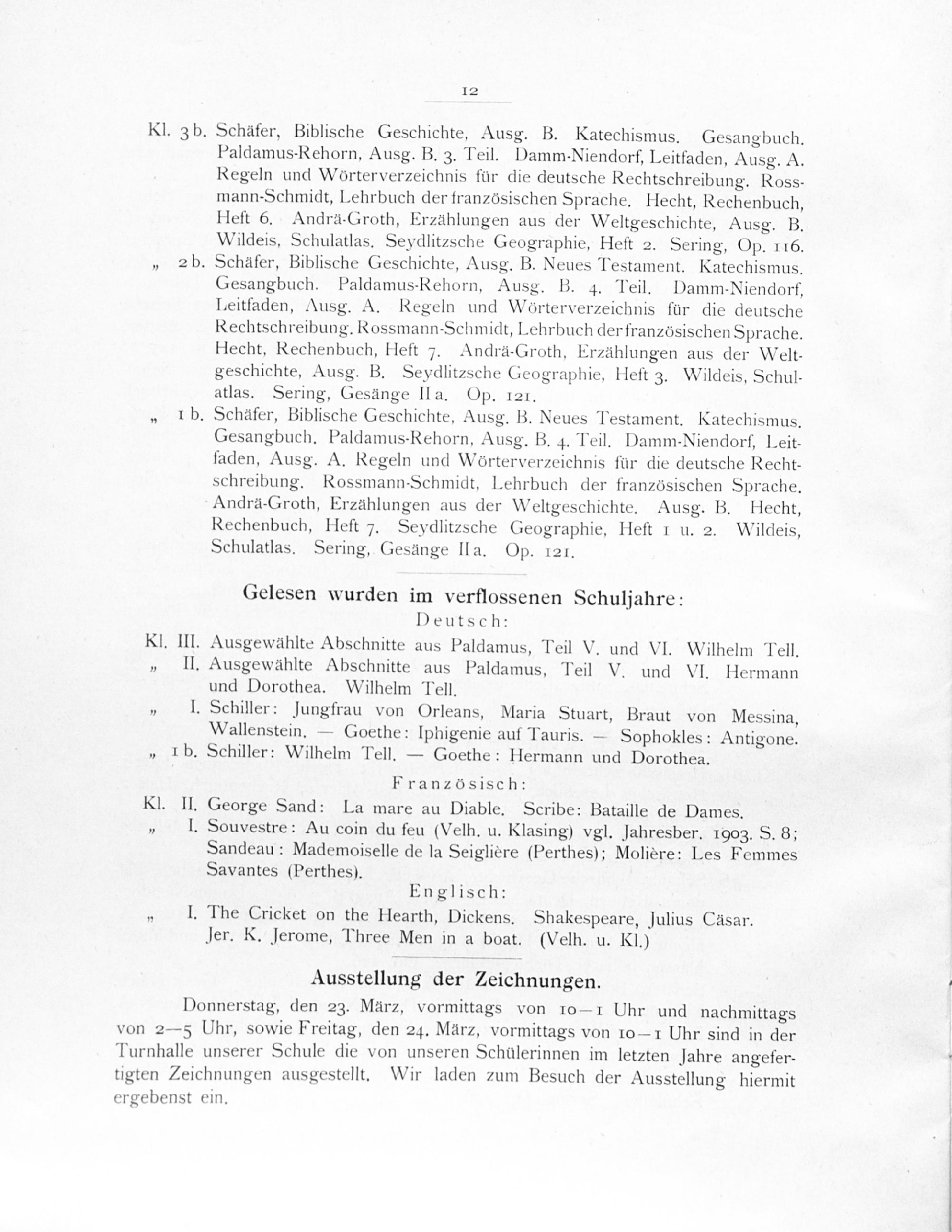 Paldamus-Rehorn, Ausg. B. 3. Teil. Damm-Niendorf, Leitfaden, Ausg. A. Regeln und Wörterverzeichnis für die deutsche Rechtschreibung. Ross- mann-Schmidt, Lehrbuch der französischen Sprache. Hecht, Rechenbuch, Heft 6. Andrä-Groth, Erzählungen aus der Weltgeschichte, Ausg. B. Wildeis, Schulatlas. Seydlitzsche Geographie, Heft 2. Sering, Op. 116.