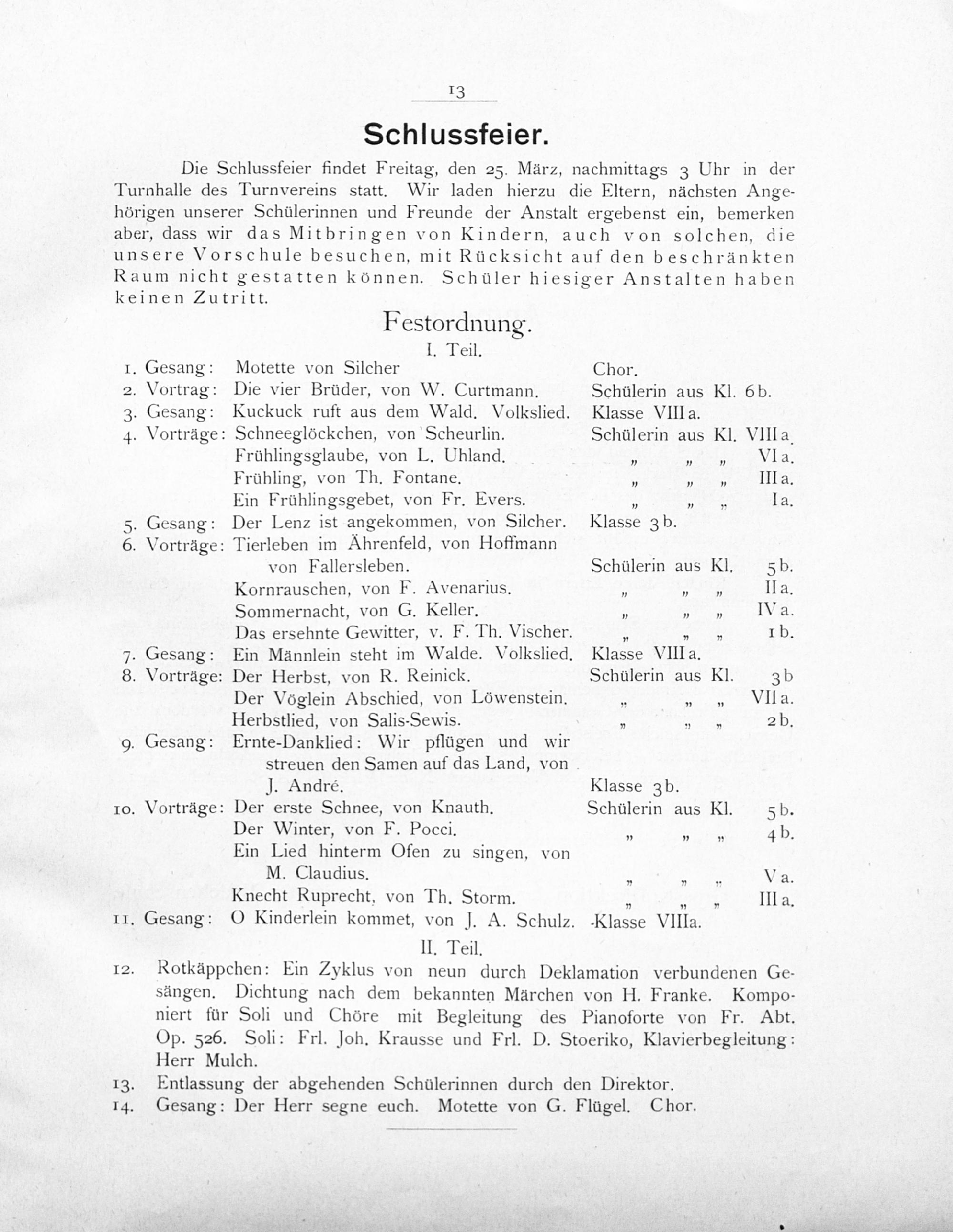 II. Teil. Rotkäppchen: Ein Zyklus von neun durch Deklamation verbundenen Ge- sängen. Dichtung nach dem bekannten Märchen von H. Franke. Kompo- niert für Soli und Chöre mit Begleitung des Pianoforte von Fr. Abt. Op. 326. Soli: Frl. Joh. Krausse und Frl. D. Stoeriko, Klavierbegleitung: Herr Mulch. 13. Entlassung der abgehenden Schülerinnen durch den Direktor. 14. Gesang: Der Herr segne euch. Motette von G. Flügel. Chor.
