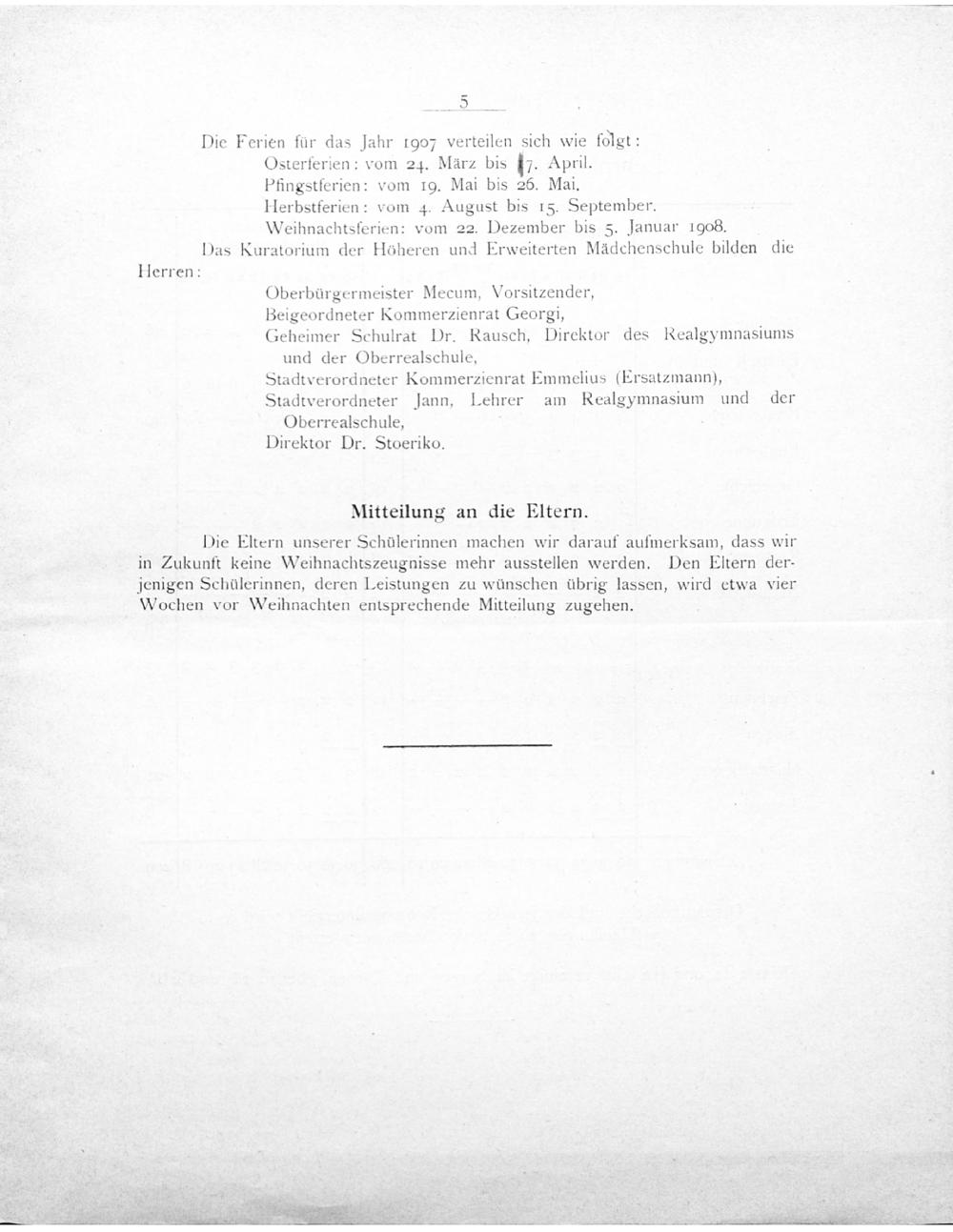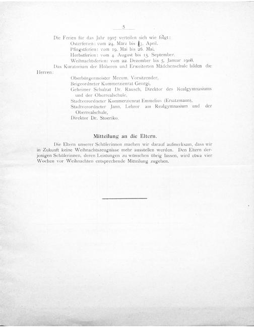 Die Ferien für das Jahr 1907 verteilen sich wie folgt: Osterferien: vom 24. März bis. April. Pfingstferien: vom 19. Mai bis 26. Mai. Tlerbstferien: vom 4. August bis 13. September. Weihnachtsſerien: vom 22. Dezember bis 3. Januar 1908. Das Kuratorium der Höheren und Erweiterten Mädchenschule bilden die Herren: Oberbürgermeister Mecum, Vorsitzender, Beigeordneter Nommerzienrat Georgi, Geheimer Schulrat Dr. Rausch, Direktor des KRealgymnasiums und der Oberrealschule, Stadtverordneter Kommerzienrat Emmelius(Ersatzmann), Stadtverordneter jann, Lehrer am Realgymnasium und der Oberrealschule, Direktor Dr. Stoeriko.