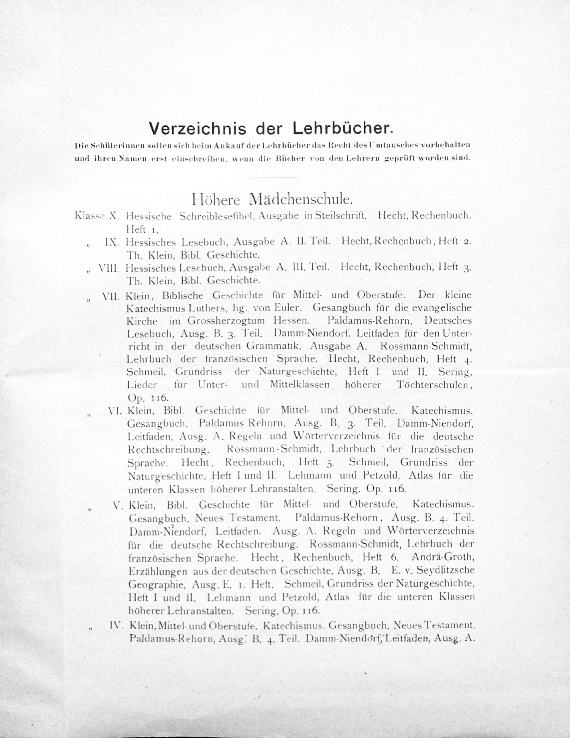 Katechismus Luthers, hg. von Euler. Gesangbuch für die evangelische Kirche im Grossherzogtum Hessen. Paldamus-Rehorn, Deutsches Lesebuch, Ausg. B. 3. Teil. Damm-Niendorf. Leitfaden für den Unter- richt in der deutschen Grammatik. Ausgabe A. Rossmann-Schmict, Lehrbuch der französischen Sprache. Hecht, Rechenbuch, Heſt 4. Schmeil, Grundriss der Naturgeschichte, Heſtl und II. Sering, Lieder für Unter- und Mittelklassen höherer Töchterschulen, Op. 116.