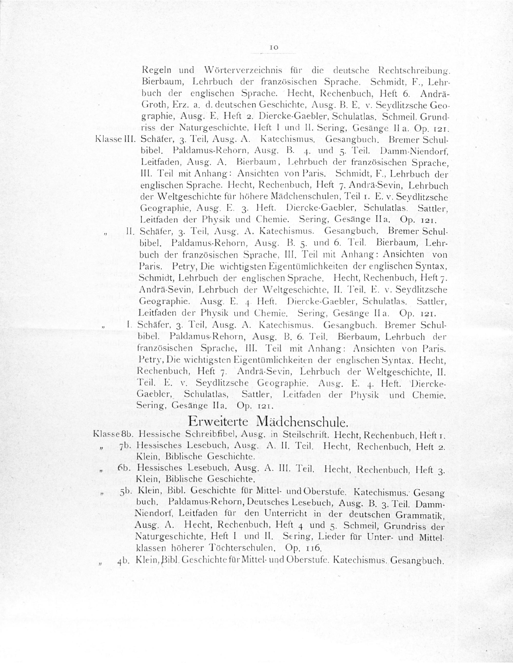 bibel. Paldamus-Rehorn, Ausg. B. 3. und 6. Teil. Bierbaum, Lehr- buch der französischen Sprache, III. Teil mit Anhang: Ansichten von Paris. Petry, Die wichtigsten Eigentümlichkeiten der englischen Syntax, Schmidt, Lehrbuch der englischen Sprache. Hecht, Rechenbuch, Heſt 7. Andrä-Sevin, Lehrbuch der Weltgeschichte, II. Teil. E. v. Seydlitzsche Geographie. Ausg. E. Heft. Diercke-Gaebler, Schulatlas. Sattler, Leitfaden der Physik und Chemie. Sering, Gesänge lha. Op. 121. Schäfer, 3. Teil, Ausg. A. Katechismus. Gesangbuch. Bremer Schub bibel. Paldamus-Rehorn, Ausg. B. 6. Teil. Bierbaum, Lehrbuch der französischen Sprache, III. Teil mit Anhang: Ansichten von Paris. Petry, Die wichtigsten Eigentümlichkeiten der englischen Syntax. Hecht, Rechenbuch, Heft 7. Andrà-Sevin, Lehrbuch der Weltgeschichte, II. Teil. E. v. Seydlitzsche Geographie. Ausg. E. 4. Heſt. Diercke- Gaebler, Schulatlas, Sattler, Leitfaden der Physik und Chemie. Sering, Gesänge Ila. Op. 121.