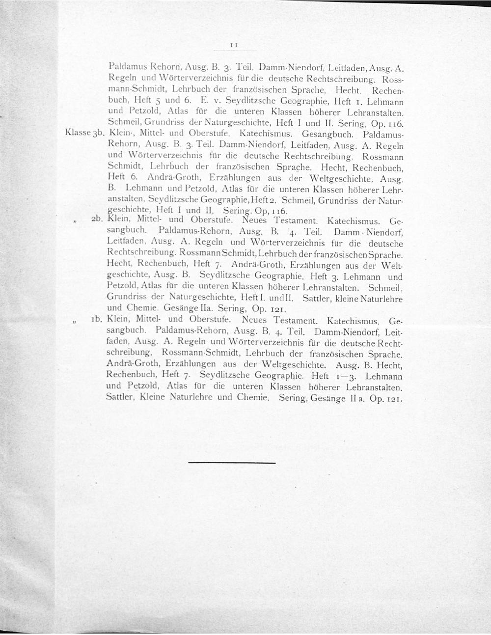 Klein, Mittel und Oberstufe. Neues Testament. Katechismus. Ge- sangbuch. Paldamus-Rehorn, Ausg. B. 4. Teil. Damm-Niendorf, Leit- faden, Ausg. A. Regeln und Wörterverzeichnis für die deutsche Recht- schreibung. Rossmann-Schmidt, Lehrbuch der französischen Sprache. Andrà-Groth, Erzählungen aus der Weltgeschichte. Ausg. B. Hecht, Rechenbuch, Heft 7. Seydlitzsche Geographie. Heft 1—3. Lehmann und Petzold, Atlas für die unteren Klassen höherer Lehranstalten. Sattler, Kleine Naturlehre und Chemie. Sering, Gesänge IIa. Op. 121.