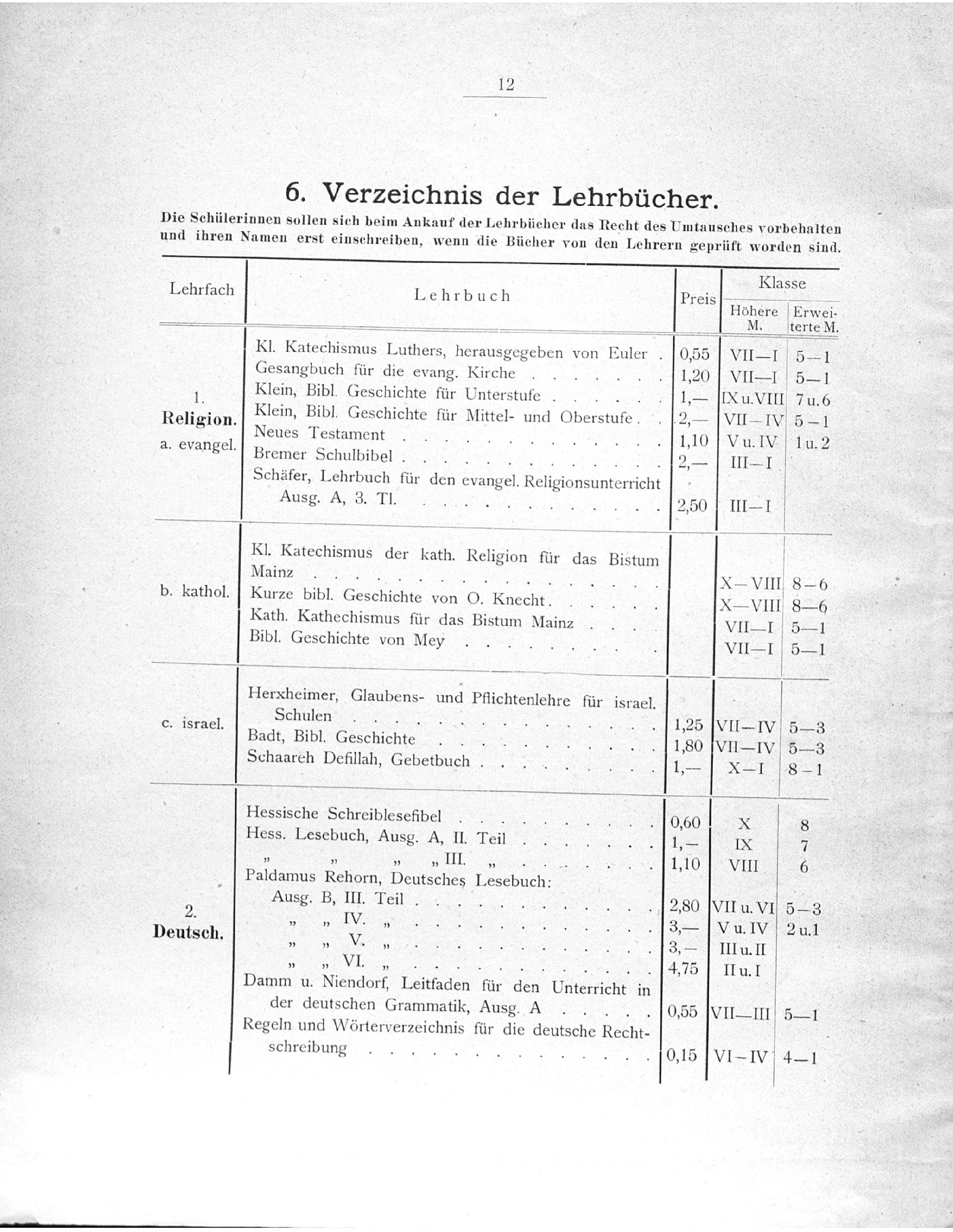 Lehrbuch Preis Kl. Katechismus Luthers, Heranscegoher von Euler 0,55 Gesangbuch für die ev ang. Kirche..... 1 20 Klein, Bibl. Geschichte für Unterstufe. 1,— Klein, Bibl. Geschichte für Mittel- und Oberstufe 2,— Neues Testament 1,10 Bremer Schulbibel.. 2,— Schäfer, Lehrbuch für den Keiionsunterricin Ausg. A, 3. TIl. 2,50