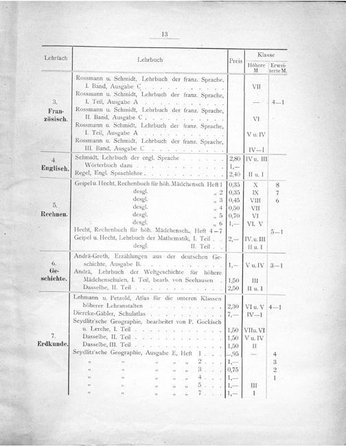 Klasse Lehrfach Lehrbuch Preis— Höhere Erwei- —— M terte M. Rossmann u.. Schmidt, Lehrbuch der franz. Sprache, I. Band, Ausgabe C. VII Rossmann u. Schmidt, Lehrbuch der franz. Sprache, 3. I. Teil, Ausgabe A— 4—1 Fran- Rossmann u. Schmidt, Lehrbuch der franz. Sprache, zösisch. II. Band, Ausgabe C. VI Rossmann u. Schmidt, Lehrbuch der franz. Sprache, I. Teil, Ausgabe A V u. IV Rossmann u. Schmidt, Lehrbuch der franz. Sprache, III. Band, Ausgabe C IVO I 4 Schmidt, Lehrbuch der engl. Sprache. 2,80 IVu. III Englisch Wörterbuch dazu. 1,— 3 Regel, Engl. Sprachlehre. 2,40] II u. I Geipelu. Hecht, Rechenbuch für höh. Mädchensch. llelt 0,35 X 8 desgl.„ 2[0,35 IX 7 desgl.„ 3[0,45 VIII 6 5. desgl.„ 4[0,50 VII Rechnen. desgl.„ 5[0,70]0 VI desgl.„ 6 1,— VIl. V Hecht, Rechenbuch für höh. Mädchensch., Heft 4— 7 5—1 Geipel u. Hecht, Lehrbuch der Mathematik, I. Teil. 2,—[IV. u. III desgl. II. Teil II u. I Andrä-Groth, E rzählungen aus der deutschen Ge- 6. schichte, Ausgabe B..... 1,— V u. IV 3 1 Ge- Andrä, Lehrbuch der W ekgeschichte für höhere schichte. Mädchenschulen, I. Teil, bearb. von Sechausen ,50 I Dasselbe, II. Teil. 2,50 II u. I Lehmann u. Petzold, Atlas für die unteren Klassen höherer Lehranstalten 2,30 VI u. V 41 Diercke-Gäbler, Schulatlas. 7,— IV=I Semähie sche Geographie, bearbeitet von p. Gockisch Lerche, I. Teil. 1,50 VIIu. VI 7. Darselbe II. Teil. 1,50 V u. IV Erdkunde. Dasselbe, III. Teil.... 1,50 II Seydlitz'sche Geographie, Ausgabe E Heñ 1.—,95— 4 4 6„ 2. 1,— 3 „, 3„„ 83 0,75 2 „. 8, 4. 1.— 1 „„„„ 5. 1,— III „ 8„„ 7 1,— 1