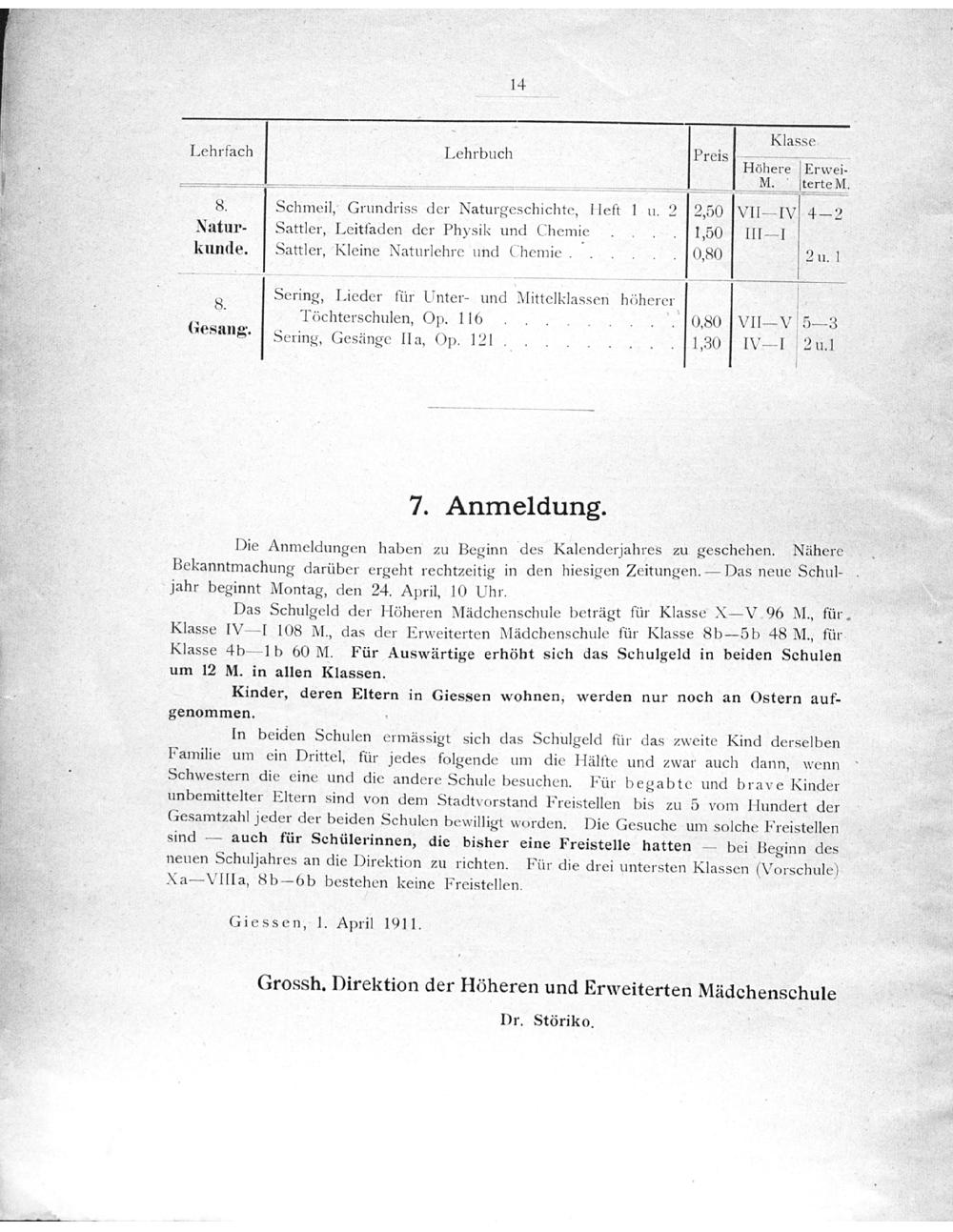 Das Schulgeld der Höheren Mädchenschule beträgt für Klasse X—V 06 M., für. Klasse IV— I 108 M., das der Erweiterten Mädchenschule für Klasse 8b— 5b 48 M., für Klasse 4 b— 1b 60 M. Für Auswärtige erhöht sich das Schulgeld in beiden Schulen um 12 M. in allen Klassen.