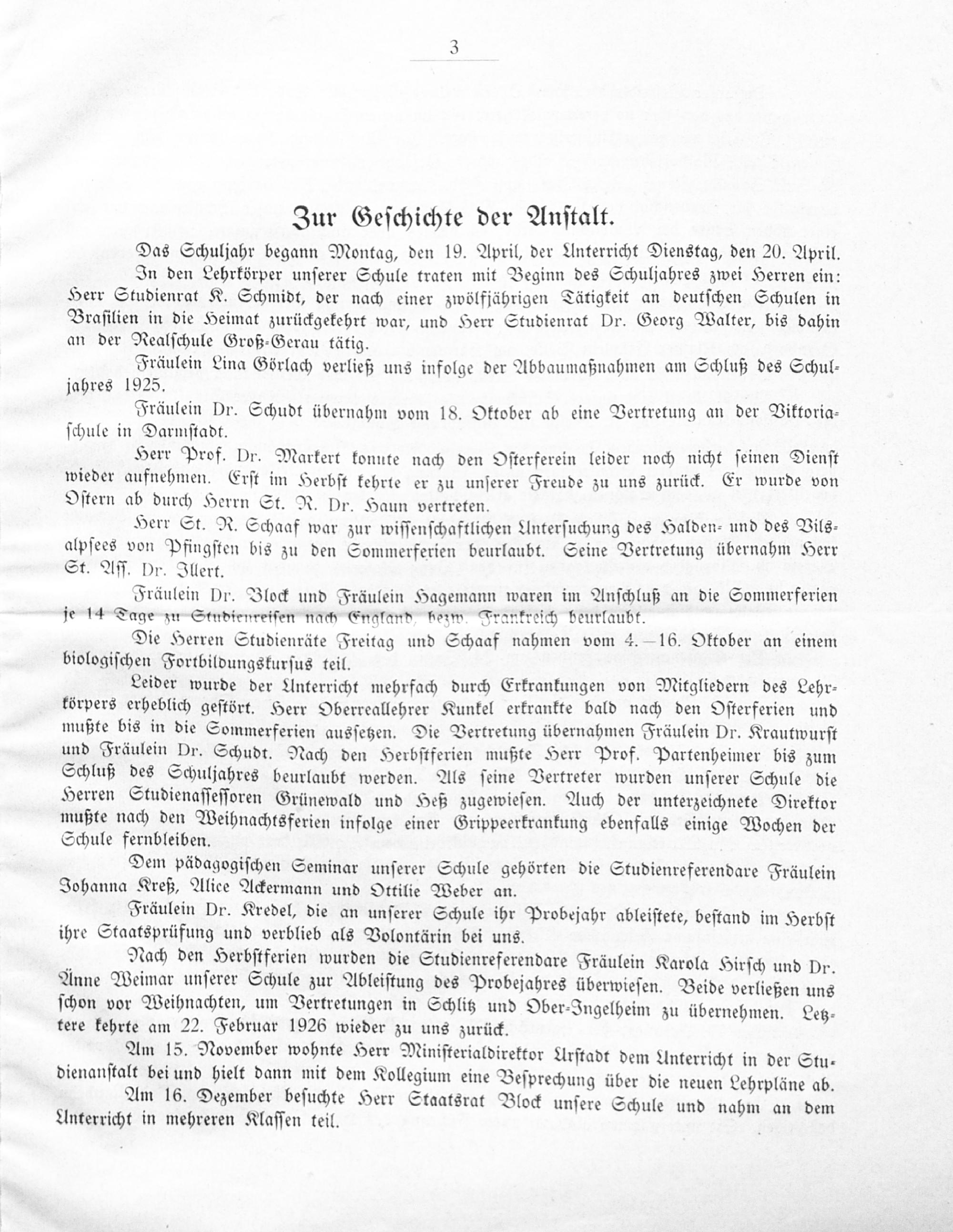 Dem pädagogiſchen Seminar unſerer Schule gehörten die Studienreferendare Fräulein Johanna Kreß, Alice Ackermann und Ottilie Weber an.