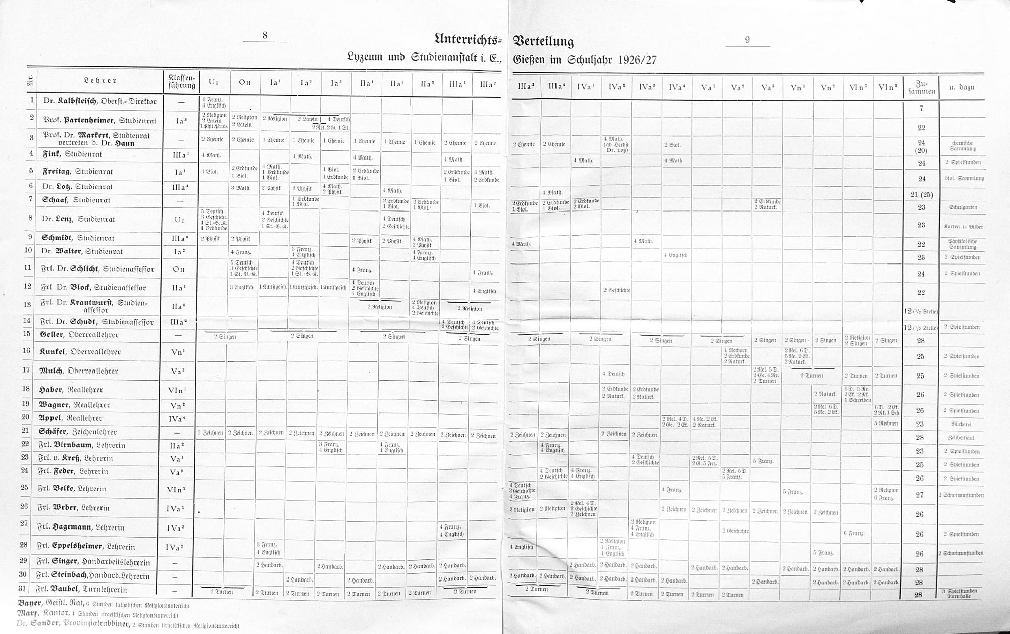 . 8————— 5 Lehrer Flaſſen⸗.. 123.. ſ ſ ſ = ſührung UI Onl Ia la 1a Ila Ila IIa Illa IIIa* IIIla IIa lIVa lVa- IVa: Wa: Vat Va* Va* Vn! Vn⸗ VIn VIn: ſn Funen u. dazu 1 i SDi— 3 Franz. ſ.— 1 Dr. Kalbfleiſch, Oberſt.⸗Direktor 1 deauge, ſ 7 Mi—————— 2 Prof. Partenheimer, Studienrat Ias 2 dolänͤo 2 Religion 2 Religion—= Laleln Dautſch— — 1hil. Prop. 2 Latein 2 G. 18t. 22 Prof. Dr. Markert, Studienrat 2 Cßemſe e— 7———————— 3 vertreten d. Dt. Haun— 2 Chemie 2 Chemie(1 Chemie(1 Chemie 1 Chemie 1 Chemie 1 Chemie 1 Chemie 2 Chemie 2 Chemie 2 Chemie 2 Chemie 2diſen 2 Liol. 24 dhenüche —. 1Leg— Dr. Lot)(20) Sammlung 4 ink, Studien 1 1 p.—————. 6 Fink, ie arat U IIIa 1 Marſ. 1 Math. 1 Math. ¹ Math. 4 Math. 4 Math. 24 ielſtunden . 2G 1 Math.——————— 5 Freitag, Studienrat la fi siel. 2 Eedtunde 1 Grdlunde 1 Vicl. 2 Erdtunde ¹ Math. 1 Biol. 1 Viol⸗ 1Erdtunde 1 Biol. 2 Erdkunde 24 biol. Sammlung 6 Dr. Lotz, Studienre 4 3 2 Phyſi 2 Plyſit 4 Math.— 4———— .61 t, enrat IIla l[a. Puufit 2 Pipſit 2 orſt aMath. 1 Maath. 21(25) 7 Schaaf, Studienrat— 1 Erdtunde f ZErdkunde 2 Erdtunde— Erdkunde—Erdeumde 2 Erdkunde ſi LErdünide— —— chaaf,—— Biol.— 1 Biol. 2Blinde 1 Biol. Idliude 1 Srin 2 Biol. 2 Naturk. 23 Schulgarten „.— 4¹ Deutſch W———— 2 5—— 1 8 Dr. Lenz, Studienrat UI 2 Geſchichte Deutſch 23 1 St.⸗B. K. 2 2 Karten u. Bilder 3 J— ran—————— 4 Schmidt, Studienrat IIIa* 2 Phyſit 2 Pbyfit 1Nſs 4 Math. 4 Matw. ——— Fran——————— 5———— 10 Dr. Walter, Studienrat Ia: Feanz. 1 Srahe 1 Engliſch 11 l. Dr. S 3Dentſch——— n——-—— rl. Dr. i Studi ſſor Geſchichte 2 Geſchichte F 11 a r ſcchlicht, Studienaſſeſſor OnI 1 Heihichn Seſn.- 1 Suus. 2 2 2,—. Deutſch———————— 12 Frl. Dr. Block, Studienaſſeſſor IIa¹ 3 Engliſch ſrauunrae l uniſiztne* Weſchſchr 22 1—— Engliſch —„——— lm—————————— 13] Frl. Dr⸗ Krautwurſt, Sindien⸗ llas ² Rtligion 1 Dengſch 2 —— aſſeſſäe 8— 4 Jemich 5 Weſſce 4 12 ½ Steue 14 Frl. Dr. Schudt, Studienaſſeſſe 2 8— 14 Deutſch. 4 demh⸗-——— 44 F chudt, naſſeſſor IIIa— 3 Geſcch 4 Seiezichie— 12 ½ Stelle 15 Geller, Oberreallehrer— 2Singen 2 Singen—— Singen 28 ———— ore 1 1 Rechuen 16 Kunkel, Oberreallehrer Vn 2 Erdtunde 25 Spielſtunden —.—————[2 Naturk. r 3. Seut.. 17 Mulch, Oberreallehrer Va.— ¹ Deutſch 2 Turnen 2 Turnen 2 Turnen 25 Spielſtunden R. r 1 ö 2 Erdtunde— 18 Haber, Reallehrer VIn 2 Paturk. 2 Naturt. 3 Et. 26 2 Spielſtunden 19 Wagner, Reallehrer Vn* 3 5 8 Et. ———— ͦ—,— 2 Ni. 1 Sch. 1 20 Appel, Reallehrer IVa“* 5 Rechnen 23 Bücherri 21 Schäfer, Zeichenlehrer— L¹eichnen 2 Geichnen 2 Zeichnen 2 Seicnen 2 eicnenſ Beichnen 2 Seicnen 28 Zrcenſaal 22 Frl. Birnbaum, Lehreri 2 Nranz. 1 Franz.— 8 5—— 5 huerin Ma Sgliſeh Engeg 2 1— ⁰—— eutſch— 23 Frl. v. Kreß, Lehrerin VJS 3 ²Eeſchichte 5 Fruns. 25 leſſtunden 24 Frl. Feder, Lehreri 2- TMas Z.ua,,——— 24 Frl Feder, Lehrerin V 2² Geſclichte 1 Cnglſc 26 leſtunden 5 3*— 5 I eunſſch———j— 25 rl. Belke verin 2. 4 Franz. 5 Franz 2 Religion 3 F Ake, Lehrerin VIn eecct Venz. 5 Franz. Heigi 27 Schwimmſtunden 26——— EEEERA 45.+——————— Frl. Weber, Lehrerin IVa ¹ 1 2 Religion 2 Religion 2 Seſcte ichnen 2 Zeichnen 2 Zeichnen 2 Zeichnen 2 Zeichnen 2 Zeichnen 26 —— 2 27 ar Hagemann, Le——— u.. eon ·ſ—·-—Cq-—— 24 Frl. ann, Lehrerin IVa* Frand. Frans. geſchichte 68— — 8„ Sch 1 4 Engliſch 1 Engliſch 2 Geſchiihie 6 Franz. 26 — 4—— igion———————— 28 Frl. Eppelsheimer, Lehreri 2 4 Engliſch 4 Nrn,——— 28 Frl. Eppelsh⸗ ner, Lehrerin IVa 4 ſch. 1 Sen S Frs 26 He Sgwtuemſnden 29 Frl. Singer, Handarbeits in= 2 3 Sarbarb. 2 Fandard 2Srlda ₰ ger, O—— eitslehrerin U 2 Handarb. b. 2 Handarb.——* 12 Sandun. 2 Handarb. 2 Handarb. 2 Handarb. 2 Handarb. 28 30 Frl. Stei rb. L. ri———. 2 Handarb. 2 Handarb. 268— 30 Frl Steinbach Handarb Lehrerin— 2 Sandarb.] 2 Handarb. ² Handarb. 2anden dadat 2 dandars2 dandae. 2oewee ¹oundam 2Dandand enes 28 4 F r reri Turnen 2 hen—— ernen—— 31 Frl. Vaubel, Turnlehrerin— 2 Turnen 2 Turnen 2 Turnen 2 Turnen 2 Tumen 2 Turnen 2 Turnen IKTurnen— ITurnen(2 umen 2Turnen 2 Tunnen2 Tumen 28 3 Sandei