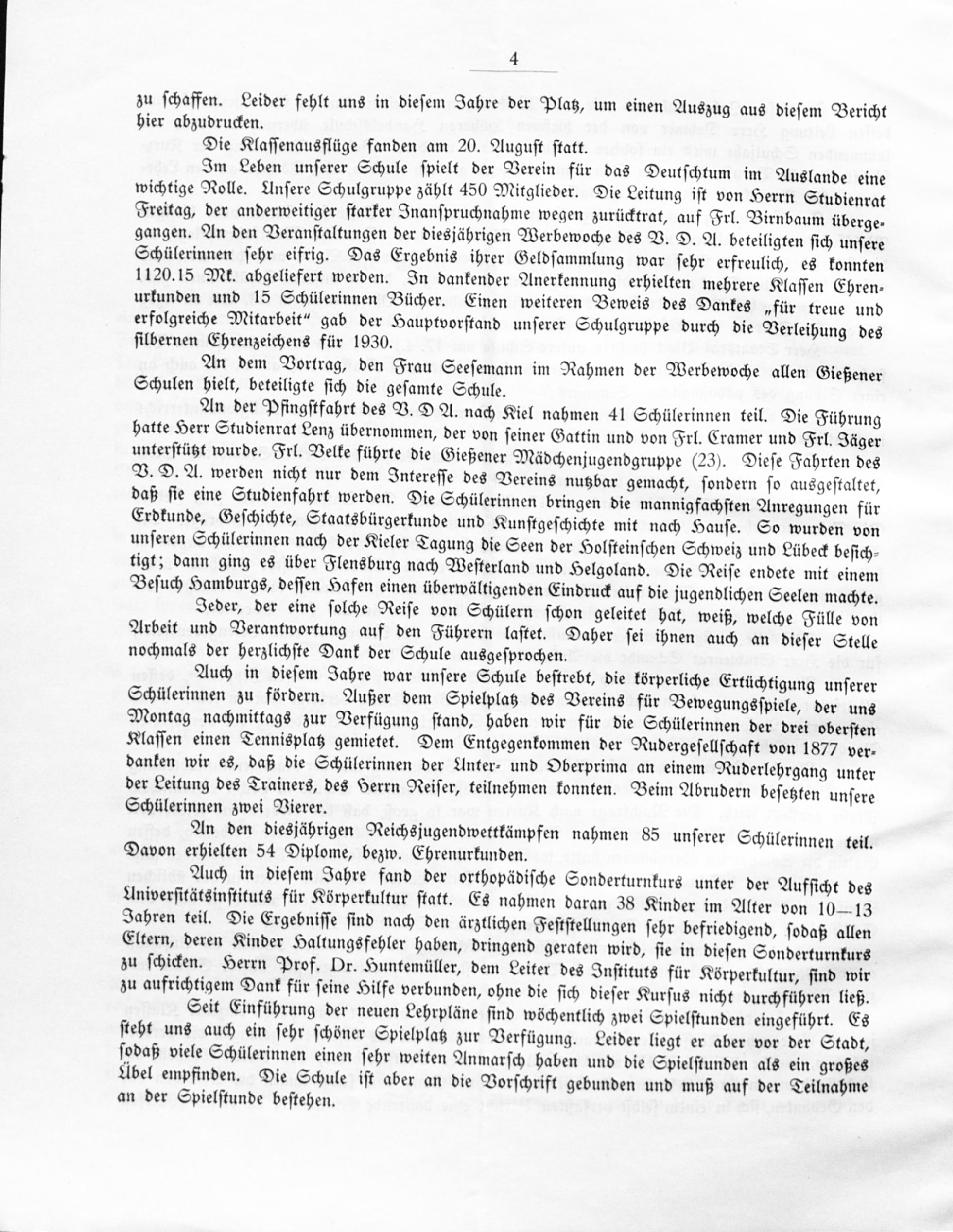 Seit Einführung der neuen Lehrpläne ſind wöchentlich zwei Spielſtunden eingeführt. Es ſteht uns auch ein ſehr ſchöner Spielplatz zur Verfügung. Leider liegt er aber vor der Stadt, ſodaß viele Schülerinnen einen ſehr weiten Anmarſch haben und die Spielſtunden als ein großes übel empfinden. Die Schule iſt aber an die Vorſchrift gebunden und muß auf der Teilnahme an der Spielſtunde beſtehen.