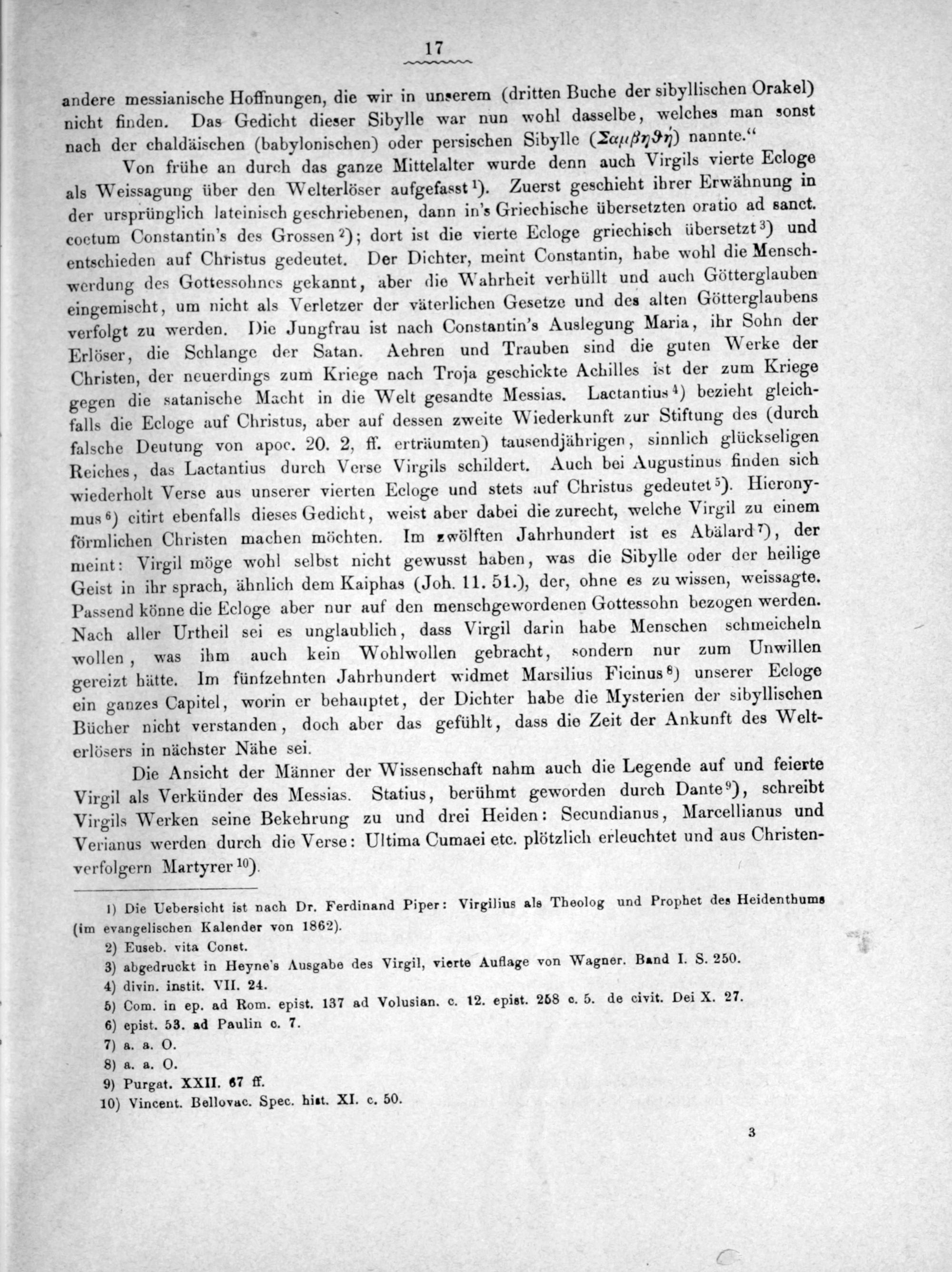 Die Ansicht der Männer der Wissenschaft nahm auch die Legende auf und feierte Virgil als Verkünder des Messias. Statius, berühmt geworden durch Dante?), schreibt Virgils Werken seine Bekehrung zu und drei Heiden: Secundianus, Marcellianus und Verianus werden durch die Verse: Ultima Cumaei etc. plötzlich erleuchtet und aus Christen- verfolgern Martyrer ¹⁰).